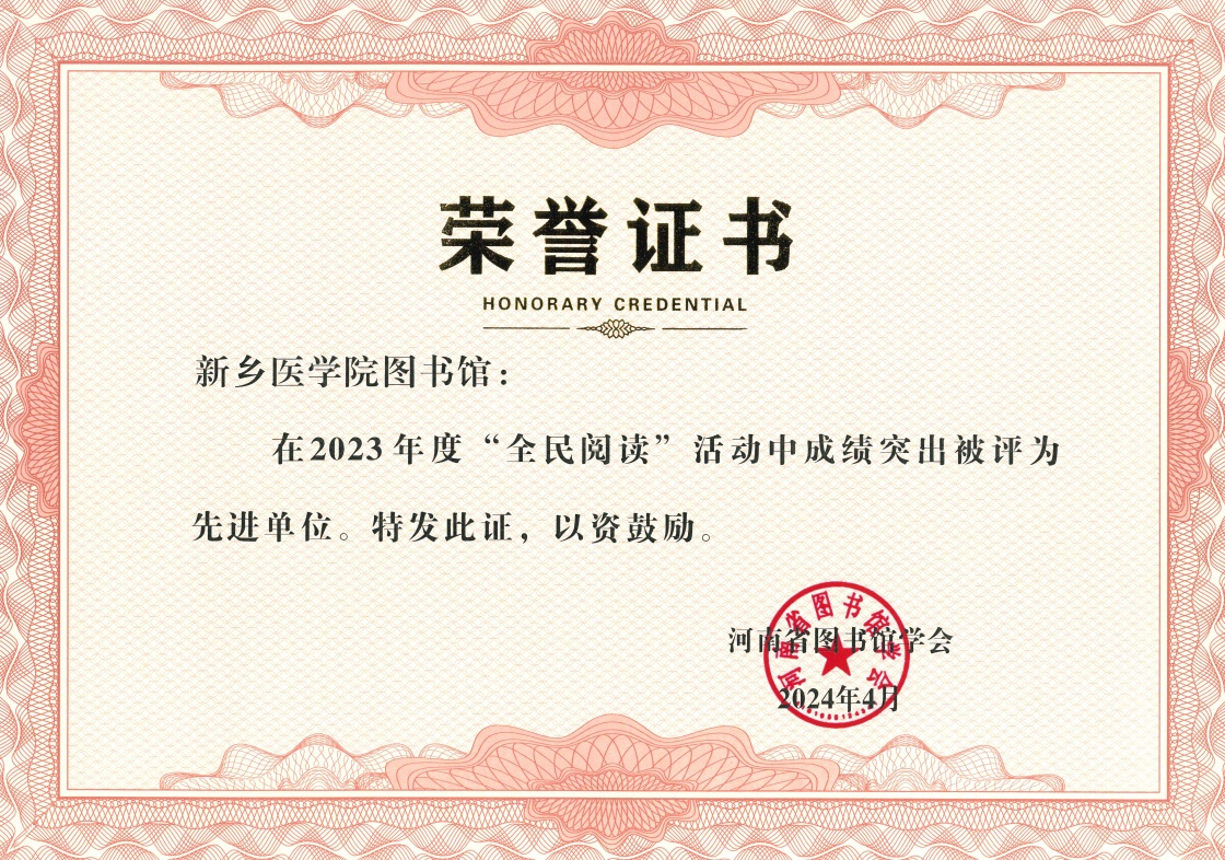 近日,河南省图书馆学会发布了《关于表彰2023年度“全民阅读”活动先进单位和先进个人的通知》,我校图书馆被评为2023年度“全民阅读”先进单位,李姝娟老师被评为“全民阅读”先进个人。