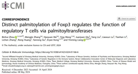 5月8日,我校第二附属医院青年教师周斌辉作为第一作者和通讯作者在免疫学1区杂志Cellular & Molecular Immunology上发表了题为"Distinct palmitoylation of Foxp3 regulates the function of regulatory T cells via palmitoyltransferases"的研究论文,该研究揭示了调节性T细胞(Tregs)中关键转录因子Foxp3的棕榈酰化修饰在抗肿瘤免疫中的重要调控作用。