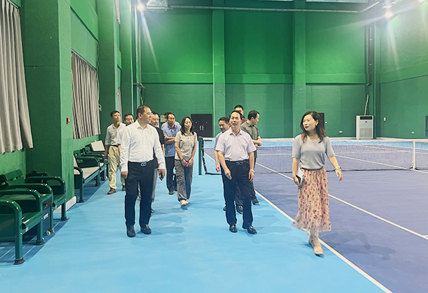 雒保军、林俊堂一行按照参观路线,在讲解员的引导下分别对游泳馆、综合馆、网球馆、健身馆、武艺馆、乒乓球馆等各个运动场馆及体育馆内文化墙、荣誉厅进行了参观。