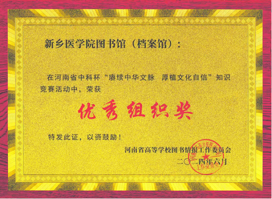 为加强书香校园建设,深入贯彻习近平文化思想,坚持立德树人、文化育人,推进文化自信自强,提升读者文化素养,丰富高校图书馆育人模式,近日,河南省中科杯“赓续中华文脉 厚植文化自信” 知识竞赛决赛在郑州举行。我校1名学生获得三等奖,3名学生获得优秀奖,1名教师荣获“优秀组织教师奖”,图书馆荣获 “优秀组织奖”。
