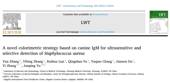 近日,国际TOP期刊LWT-Food Science And Technology在线发表了题为“A novel colorimetric strategy based on canine IgM for ultrasensitive and selective detection of Staphylococcus aureus”的研究成果。我校医学技术学院张赟副教授为该论文第一作者,华亿在线手机版(大中国区)医学技术学院为第一作者单位,我校行业导师、中国科学院武汉病毒研究所余军平副研究员和我校张轶副教授为共同通讯作者。