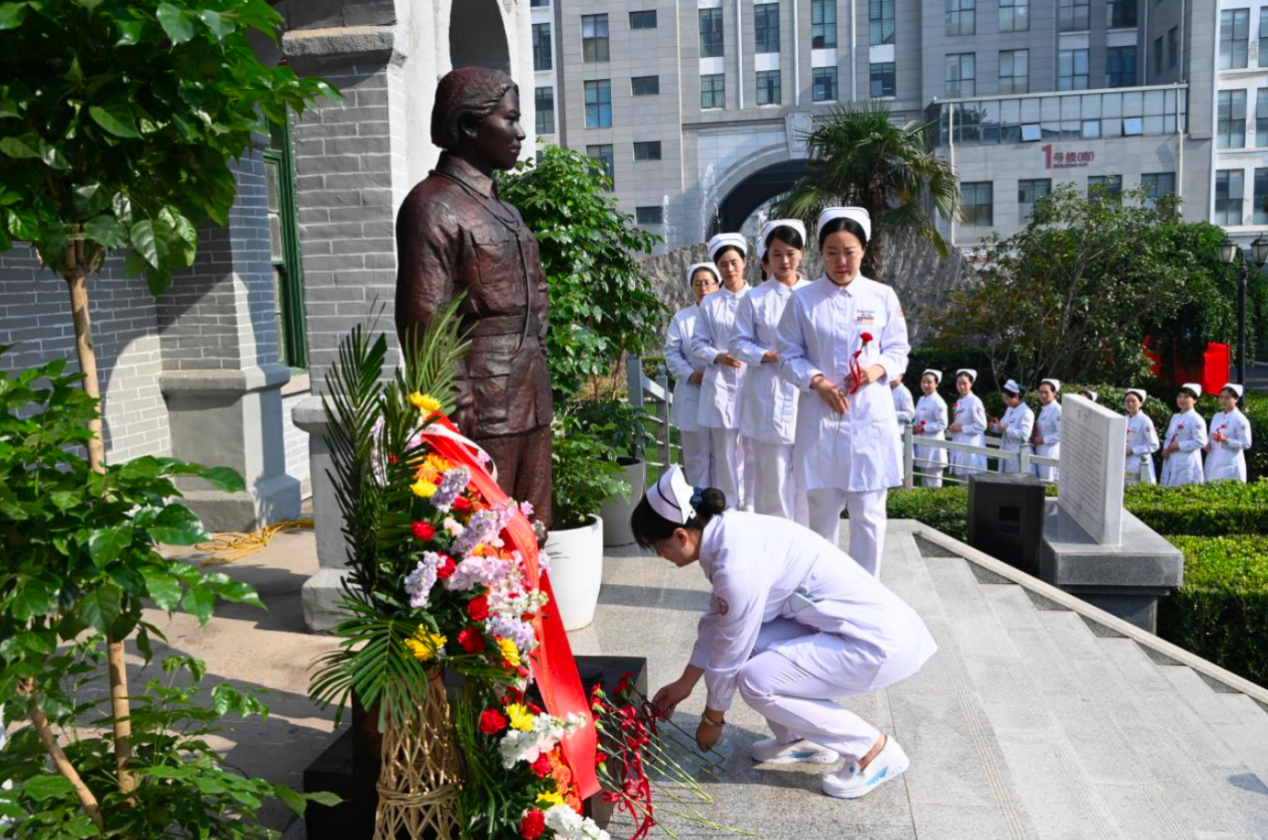 随后,举行了栗秀真护理科研创新基金奖牌的揭幕仪式,标志着护理科研创新基金正式成立。在场人员见证了栗秀真铜像的揭幕并为其敬献鲜花,以表达对栗秀真同志无尽的敬仰和深切的怀念。栗秀真铜像着一身新四军军装,左手叉腰,双眼炯炯有神。为纪念这位红色战士、杰出校友、护理先驱,她将永远矗立在院史馆,激励后人为人民健康事业贡献光和热。