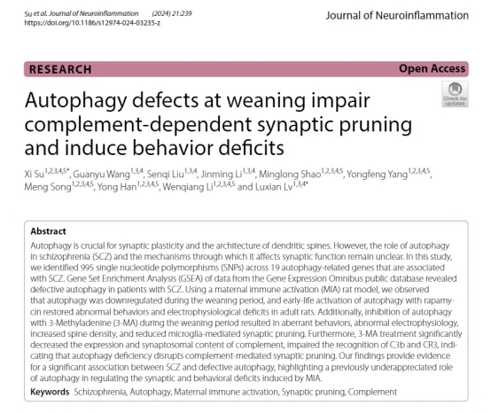 该研究通过分析自噬基因组的精神分裂症遗传易感性,鉴定出19个自噬相关基因的995个单核苷酸多态性与精神分裂症相关,并利用Gene Expression Omnibus数据库进行自噬相关基因的GSEA分析,证实精神分裂症患者中枢自噬缺陷。进一步利用母体免疫激活的精神分裂症大鼠模型,证实离乳期自噬缺陷参与模型大鼠成年期的异常行为和神经活动,增强自噬可缓解模型大鼠的异常行为,改善其异常神经活动。此外,研究结合动物和细胞实验证实自噬缺陷通过抑制补体表达损害补体介导的突触修剪过程的分子机制。该研究从自噬基因组的角度全面分析了自噬与精神分裂症的关系,首次证实自噬缺陷在母孕期免疫激活所致子代行为缺陷和神经活动异常中的作用,为理解疾病病理机制及新靶点药物研发提供重要线索。