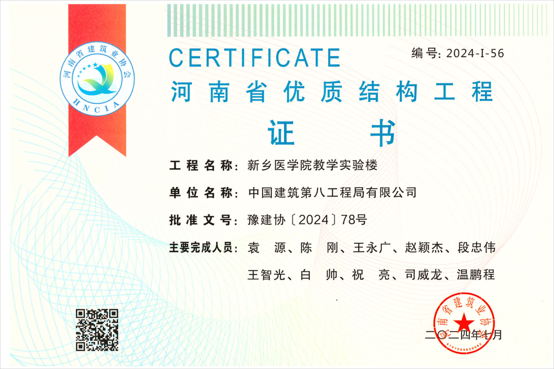 近日,我校教学实验楼项目凭借卓越的施工质量和先进的设计理念,荣获了由河南省建筑业协会颁发的“河南省优质结构工程证书”。这一荣誉不仅是对项目团队辛勤工作的肯定,也是在工程质量与技术创新方面取得显著成成绩的重要标志。