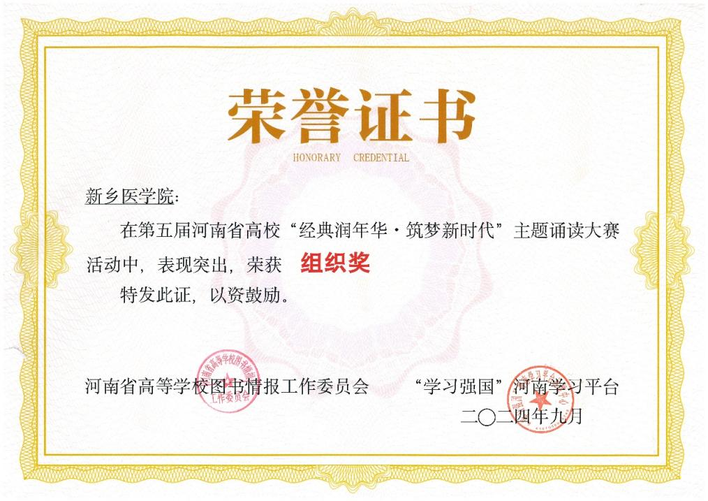 近日,第五届河南省高校“经典润年华·筑梦新时代”主题诵读大赛获奖名单公布。我校荣获“组织奖”,教师组荣获二等奖1项、网络人气奖1项,学生组荣获二等奖1项、三等奖5项、网络人气奖2项,6名教师荣获“优秀指导老师”。其中《传承华夏血脉 传颂黄河精神》《百年沧桑》两项作品入选“学习强国”河南平台,将陆续在平台进行展播。