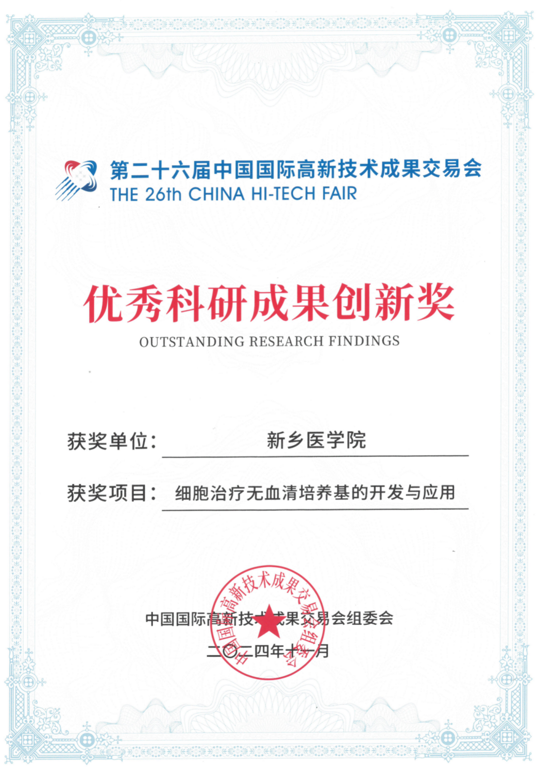 第二十六届中国国际高新技术成果交易会(以下简称“高交会”)近日在深圳国际会展中心(宝安)举办。按照教育厅通知要求,我校精心组织并严格遴选优秀科技创新成果参加现场展示活动。其中,王天云教授团队的成果“细胞治疗无血清培养基的开发与应用”获优秀科研成果创新奖。