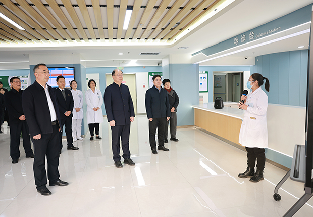 王福俤一行先后前往门诊楼、急救中心、医学检验科、生殖医学科、内分泌与代谢疾病科进行现场调研,分别听取科室负责人对科室业务开展情况介绍,现场体验“刷脸”全流程就医服务,感受优化功能布局与分区为患者就诊带来的便利,建议医院在现有规模的基础上做好未来发展规划。