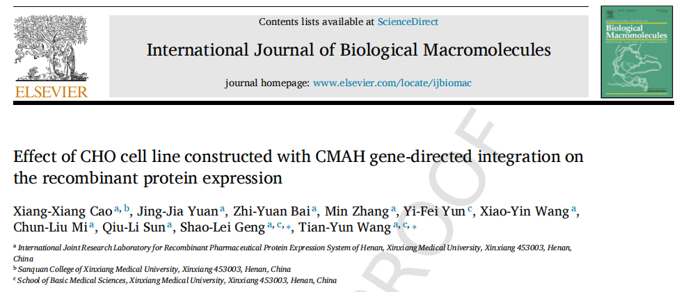近日,我校王天云教授团队在国际权威期刊International Journal of Biological Macromolecules上发表了题为“Effect of CHO cell line constructed with CMAH gene-directed integration on the recombinant protein expression”的研究论文。我校2018级研究生曹祥祥为该论文第一作者,基础医学院耿少雷博士和王天云教授为共同通讯作者。研究得到了国家自然科学基金、中原科技创新领军人才及河南省科协青年托举人才项目的资助。