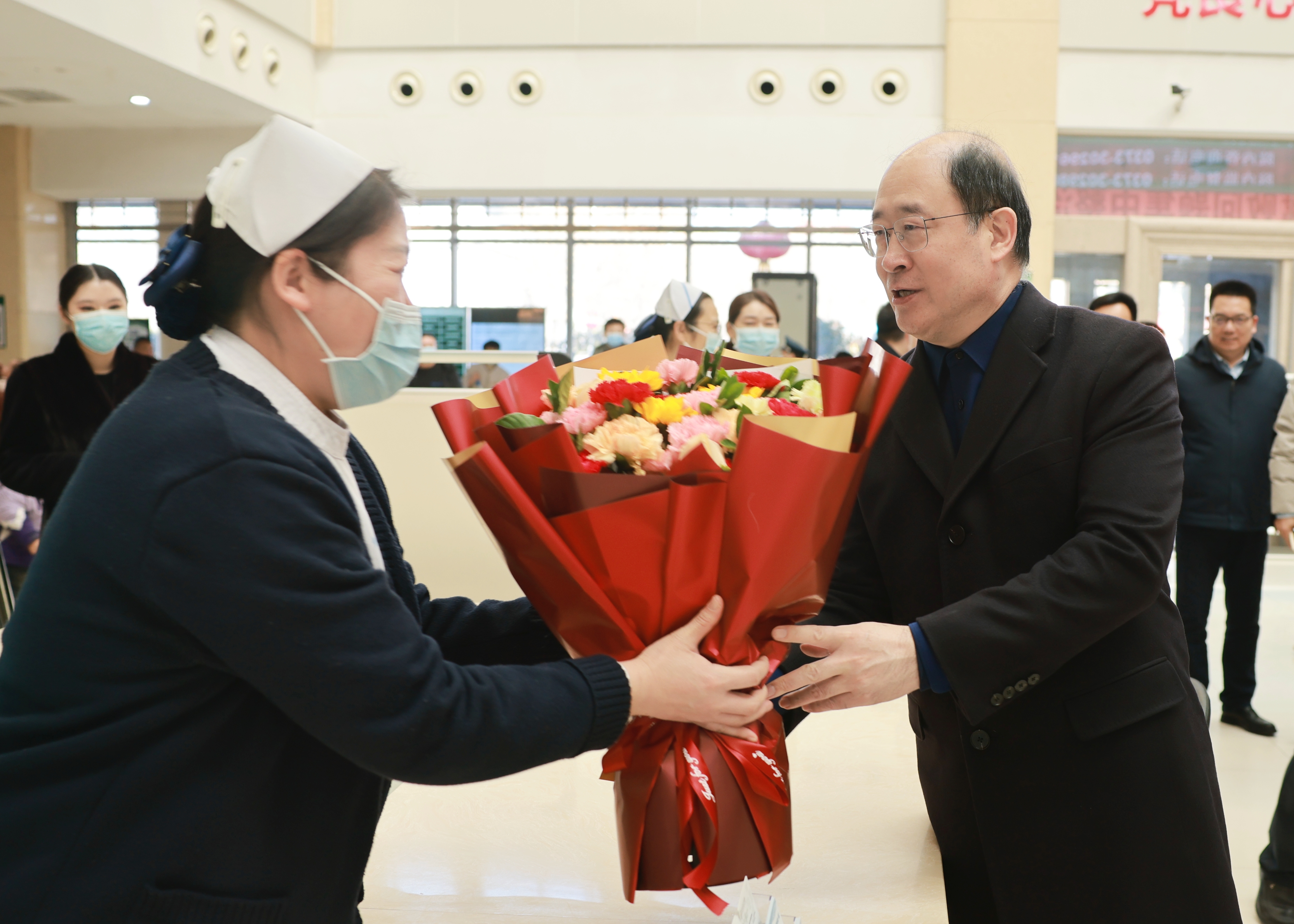 在第二附属医院,王福俤一行先后走进门诊大厅、二楼专家诊室、物理治疗中心、河南省心理咨询中心,向在场忙碌的医务人员送上新春祝福,与工作人员亲切交流,询问医务人员工作情况,并将鲜花递到辛勤工作的医务人员手中,感谢他们为医院和学校作出的努力和奉献。