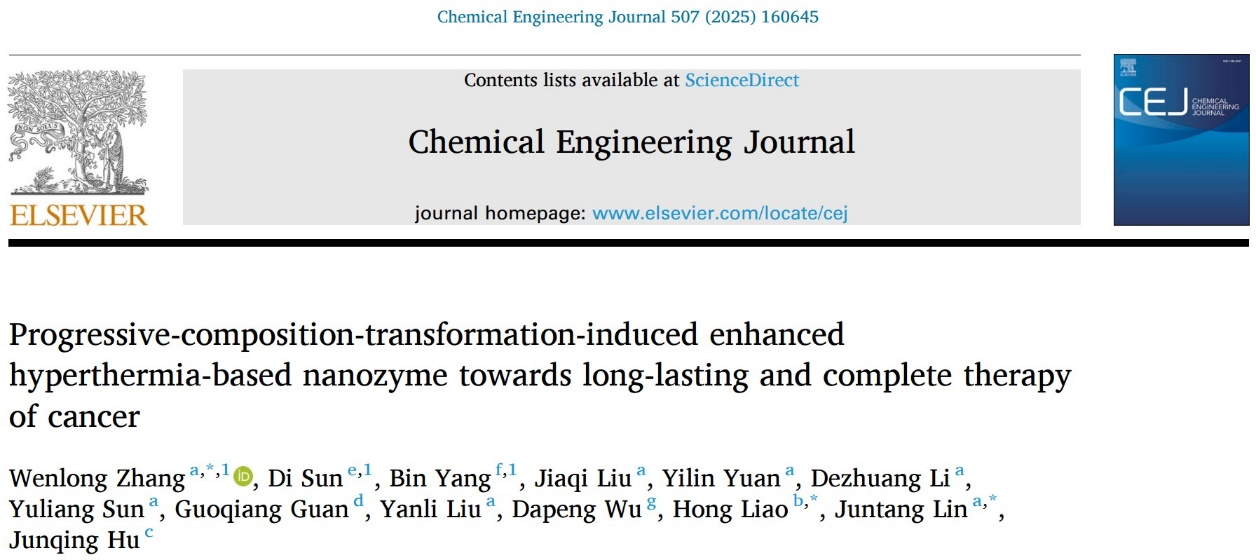 近日,我校医学工程学院青年教师张文龙博士在国际权威期刊Chemical Engineering Journal上发表了题为“Progressive-composition-transformation-induced enhanced hyperthermia-based nanozyme towards long-lasting and complete therapy of cancer”的研究论文。我校医学工程学院为本研究第一和通讯单位,张文龙博士与上海交通大学孙翟、杨彬博士为共同第一作者,林俊堂教授、同济大学廖虹教授及张文龙博士担任共同通讯作者。