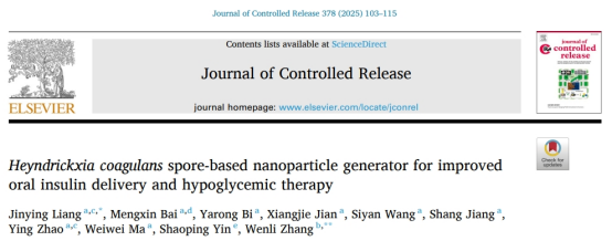 近日,我校药学院梁金英博士在国际权威期刊Journal of Controlled Release上发表题为“Heyndrickxia coagulans spore-based nanoparticle generator for improved oral insulin delivery and hypoglycemic therapy”的研究论文。我校药学院为本研究第一和通讯单位,梁金英为第一作者和通讯作者,中国药科大学张文丽副教授担任共同通讯作者。