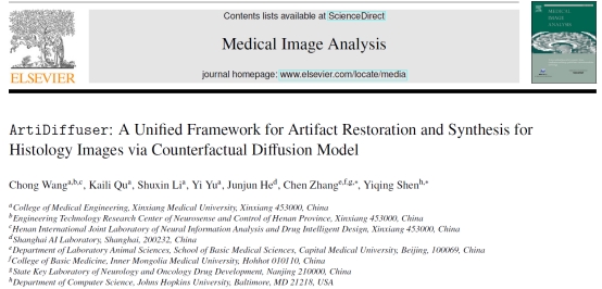 近日,医学工程学院青年教师王冲博士在国际权威期刊Medical Image Analysis上发表了题为ArtiDiffuser: A Unified Framework for Artifact Restoration and Synthesis for Histology Images via Counterfactual Diffusion Model的研究论文。王冲博士为第一作者,我校医学工程学院为第一单位。