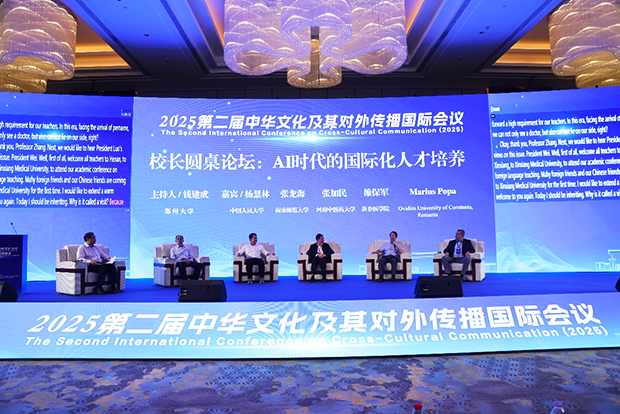 校长圆桌会议上,中国人民大学前副校长杨慧林,闽南师范大学校长张龙海,河南中医药大学党委副书记张加民,罗马尼亚康斯坦察奥维迪乌斯大学副校长Marius Popa,我校党委委员、副校长雒保军围绕人工智能背景下如何培养具有全球胜任力的优秀人才进行深入交流。雒保军从我校办学实际出发,介绍了近年来学校国际化复合型人才培养概况,提出人工智能时代对高质量人才培养是机遇也是挑战,呼吁深化多边合作,打造互鉴平台,共同培养具有世界眼光、家国情怀,服务国家、服务人民的创新型、复合型优秀人才。