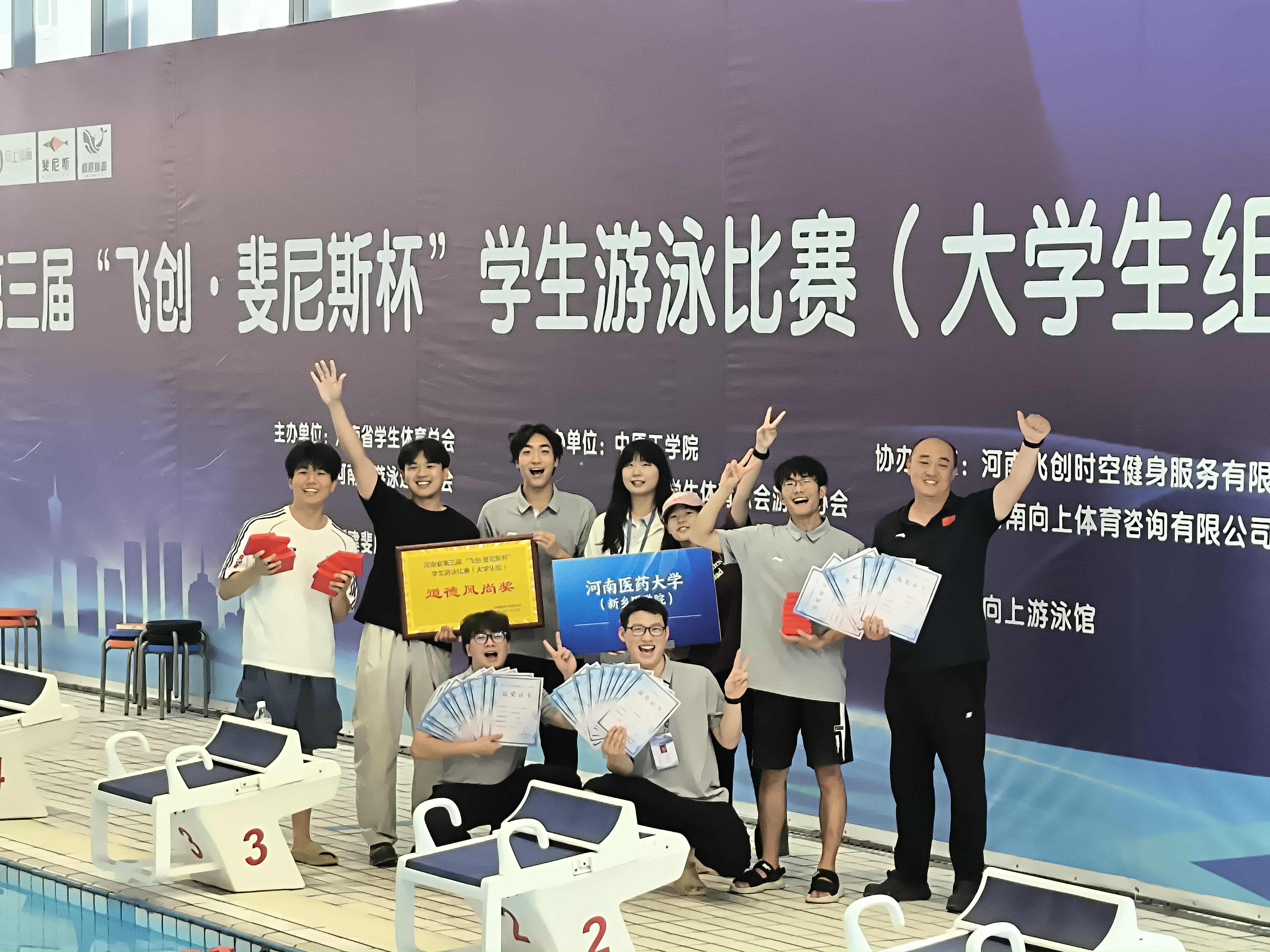在本次比赛中,我校选手奋勇拼搏、默契协作,充分展现出昂扬向上的精神风貌与精湛的竞技实力,在多个项目中斩获佳绩。男子本科甲组100米仰泳实现冠亚季军全包揽,同时在男女本科甲组50米仰泳、50米蛙泳、100米蛙泳等个人单项以及男子4×50米自由泳接力、4×50米混合泳接力等团体赛共计11个比赛项目中均斩获奖项。8名获奖运动员分别来自峻极书院秦屹晖、肖百昌;基础医学院魏赫阳、吴文韬、胡欣悦、赖语欣;公共卫生学院刘轩;儿科学院王子豪。同时,我校游泳代表队凭借出色的竞技水平和良好的精神风貌,荣获“团体总分第三名”和“道德风尚奖”,实现运动成绩与精神文明双丰收。