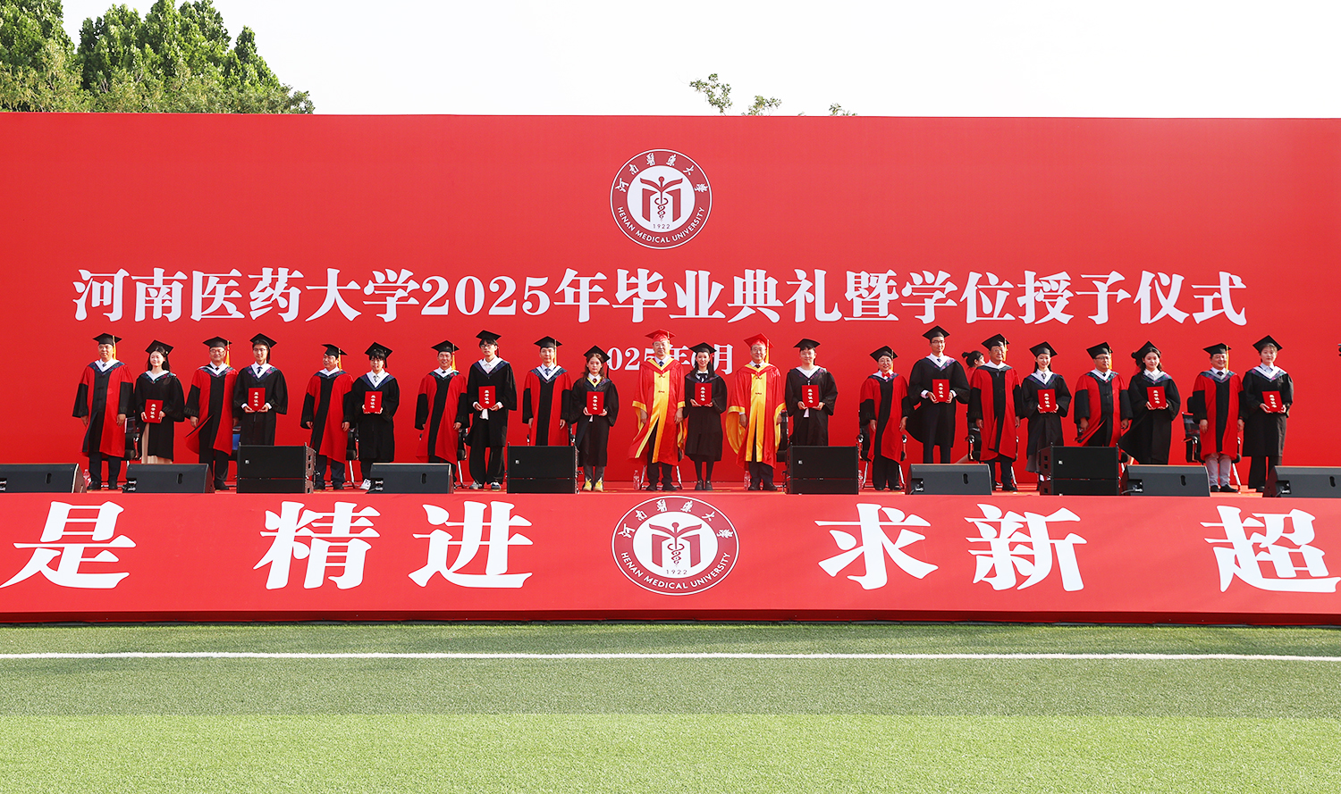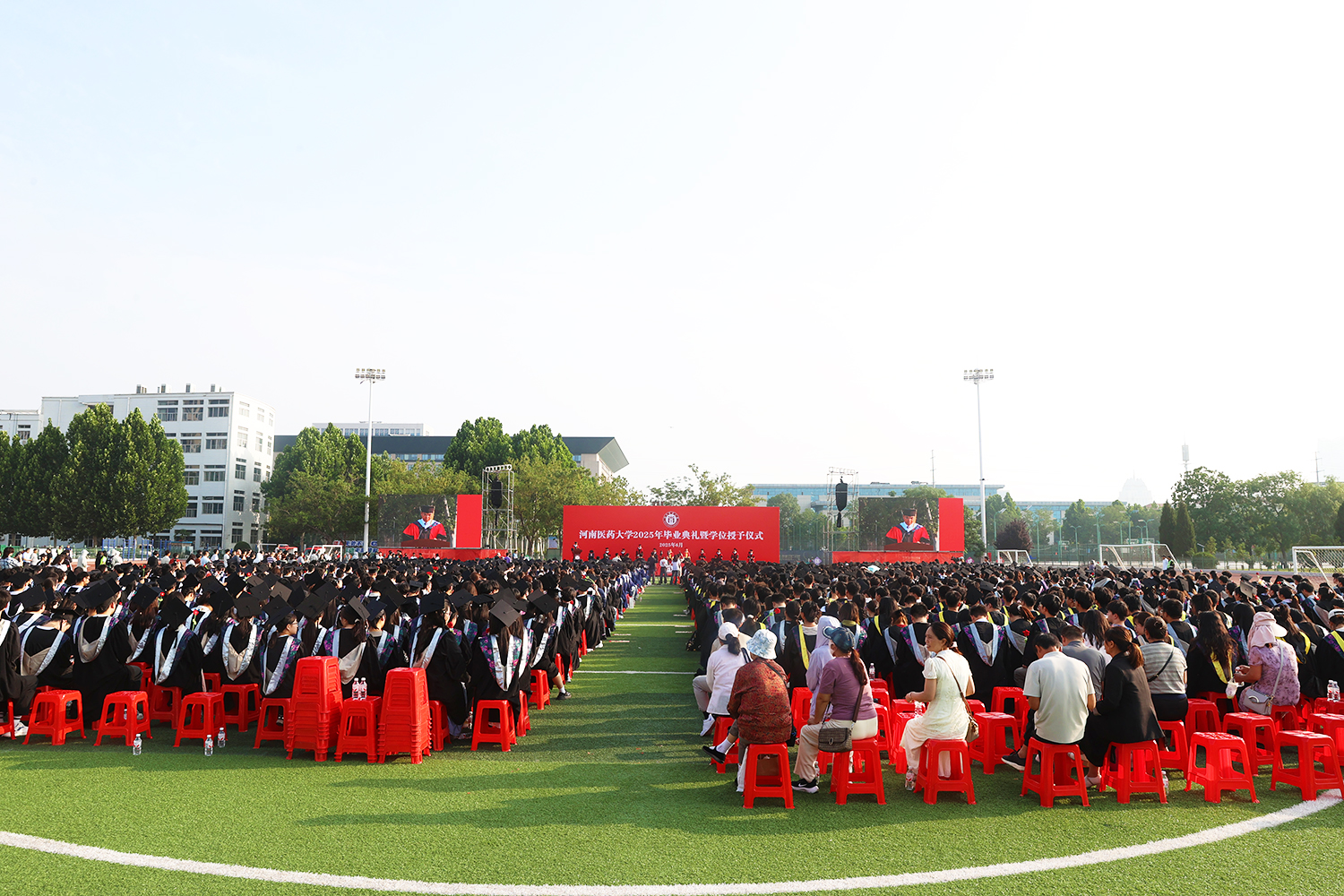 蝉鸣催夏,骊歌轻扬。6月20日清晨,我校在南校区体育场举行2025届学生毕业典礼暨学位授予仪式。4416名学子和老师、挚友分享属于河南医药大学首届毕业生的喜悦时刻。校党委书记任文杰教授宣读更名河南医药大学文件并讲话。校长王福俤教授深情寄语毕业生锚定人生坐标,以医药报国之志照亮前行之路。全体校领导出席典礼。校友代表、教师代表,学校各相关管理服务机构、学院负责人和辅导员参加典礼。毕业典礼暨学位授予仪式由校党委委员、副校长林俊堂教授主持。