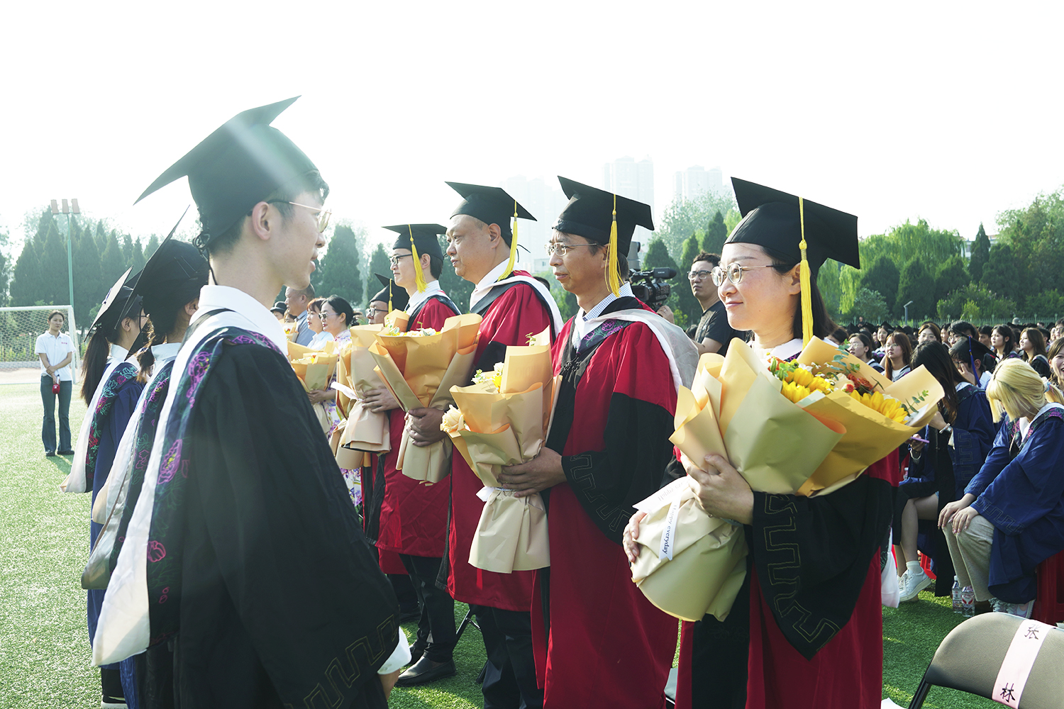 毕业生代表向教师代表献花,向躬耕教坛、辛勤育人的杏林园丁致以诚挚的谢意。