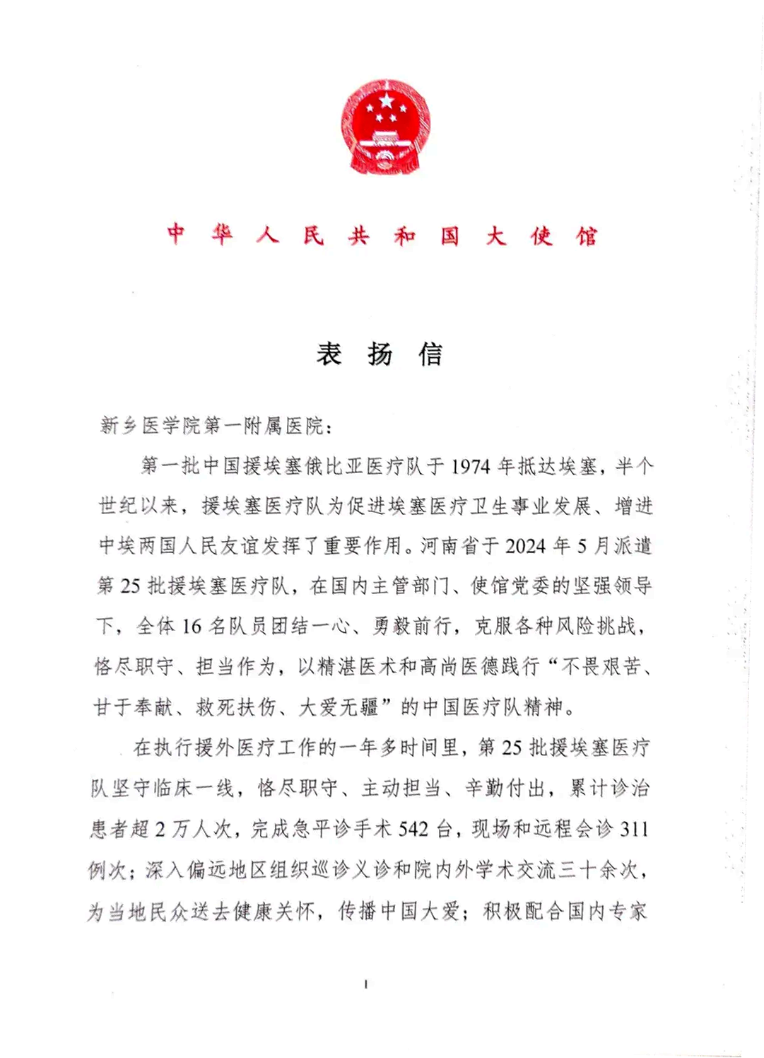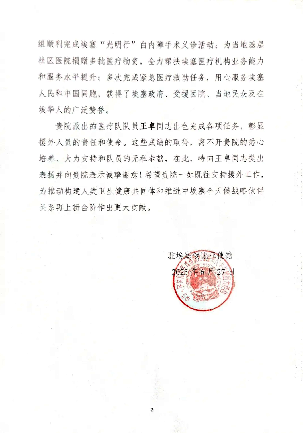 表扬信中高度赞扬了第25批援埃塞医疗队自2024年5月抵埃以来的卓越贡献。在国内主管部门、使馆党委领导下,包括王卓在内的16名医疗队员坚守临床一线,累计诊治患者超2万人次,完成急平诊手术542台,会诊311例次。他们深入偏远地区巡诊义诊、捐赠医疗物资,积极开展院内外学术交流,多次完成紧急医疗救助服务,全力帮扶提升当地医院服务水平。医疗队以精湛的医术与无私奉献的精神赢得了埃塞各界及在埃华人的广泛赞誉。