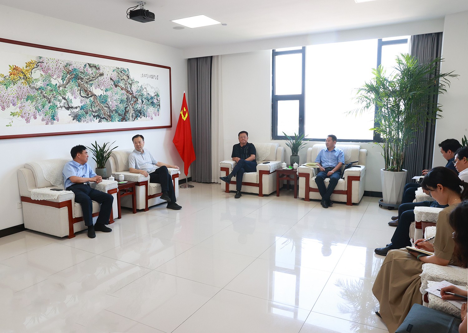 7月30日下午,校党委书记任文杰,校党委委员、副校长靳新峰来到红旗区人民政府,商议加快推进河南医药大学附属小学、幼儿园建设事宜。红旗区委书记刘宏锋,区委常委、常务副区长郭潇漪,区委常委、宣传部部长、副区长张长河等接待了任文杰一行并召开座谈会。党政办公室、后勤保障部负责人,红旗区相关职能部门负责人参加座谈。