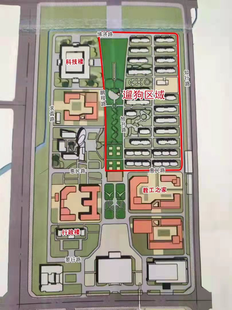 四、禁止到教学办公区遛狗,请在规定区域内(附件2)遛狗;遛狗时必须拴犬绳,及时清除排泄粪便;乘坐电梯或者上下楼梯时,要采取怀抱或者为犬只戴嘴套措施,避开高峰时间,主动避让他人;