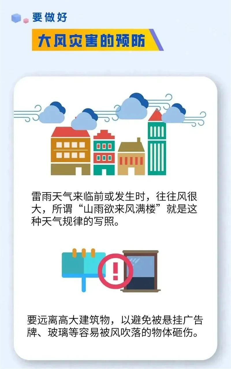 3.大风天气尽量不外出,关好门窗,如需外出,尽量避开楼宇,减少户外停留,做好个人安全防护。