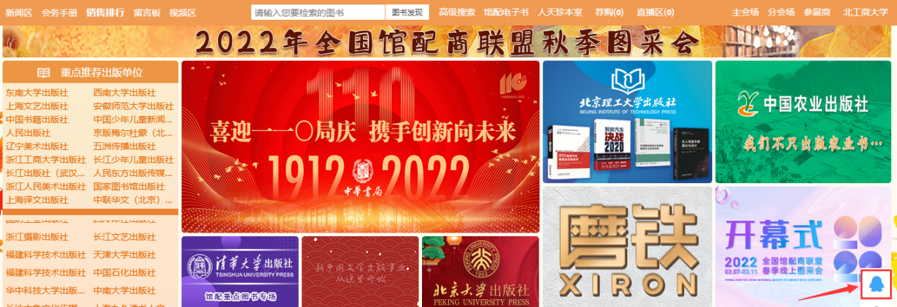 1、主会场:其右上角展示图书采会开幕式领导讲话及平台消息发布。其他板块主要展示重点出版社书目,直接点击出版社名称即可进入选书界面。