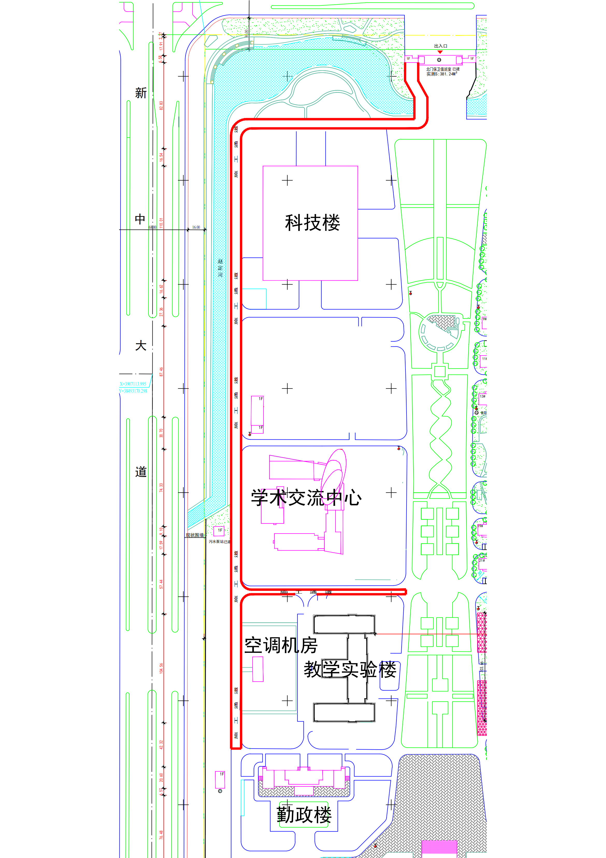 从学校北大门西侧门向南右转至博济路,由博济路向西至左转至求真路,求真路由北向南至勤政楼北侧路段,以及惠民路部分路段(鹏程路以西段)建设全封闭施工专用通道。