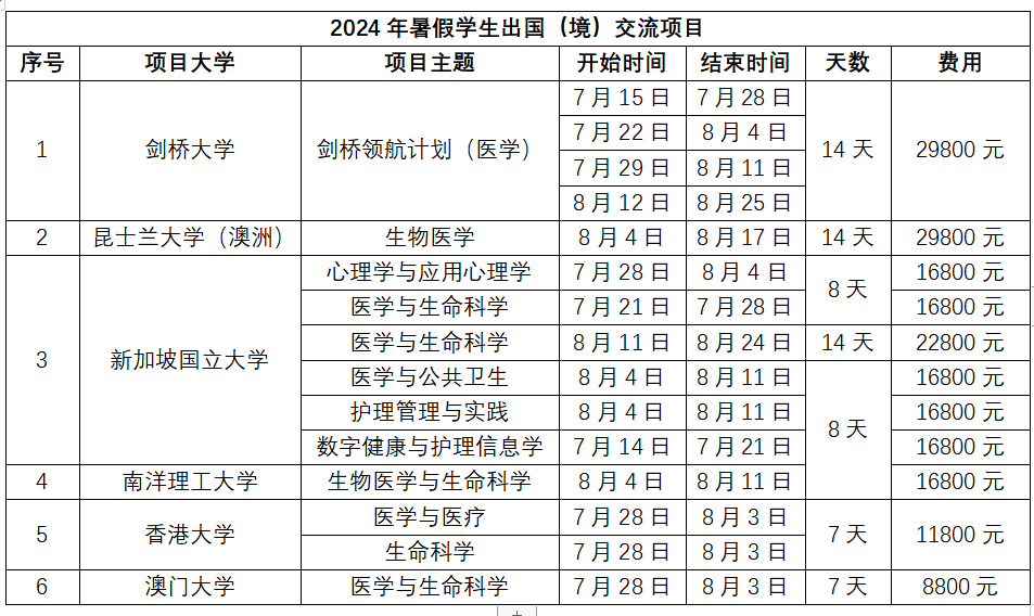 为了进一步满足我校学生增加境外学习经历、开拓国际视野的需求,学校推出2024年暑假学生出国(境)交流项目,请各学院积极宣传,做好学生报名组织工作,项目详情如下: