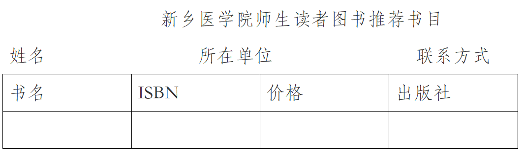 一、读者按照下列表格填写自己所需图书内容。发送至图书馆邮箱xxmulib@xxmu.edu.cn即可。
