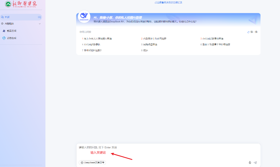 为加快推进人工智能赋能教育教学、科研创新、管理服务,探索大模型在学校的应用,推动智能体助力业务提质增效,在相关部门的大力支持配合下,学校初步建成校园AI“i小医”平台,并已接入满血版DeepSeek-R1。现将上线试运行相关事宜通知如下: