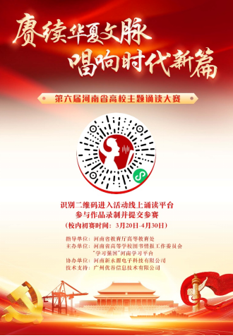 为深入贯彻落实党的二十大和二十届二中、三中全会精神与河南省委宣传部《2025年书香河南建设工程实施方案》的部署要求,加快构建学习型社会,践行“推动中华优秀传统文化创造性转化、创新性发展”时代使命,弘扬社会主义核心价值观教育,建设书香河南,丰富校园文化。河南省高等学校图书情报工作委员会在第30个“世界读书日”(4月23日)来临之际,联合“学习强国”河南学习平台举办第六届河南省高校“赓续华夏文脉·唱响时代新篇”主题诵读大赛,现将有关事宜通知如下: