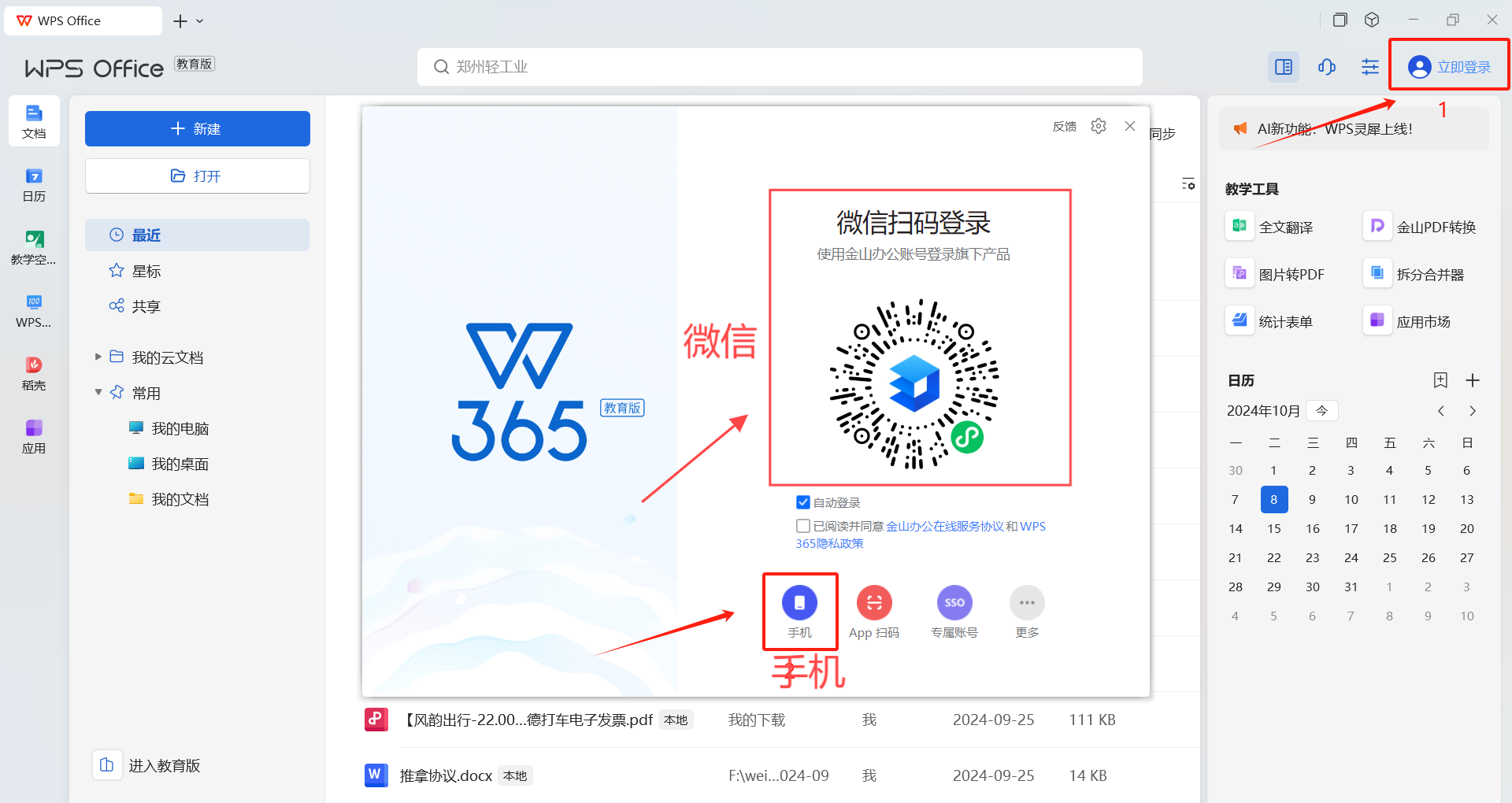 打开安装好的WPS教育版客户端,使用手机号或微信扫码登录,选择“华亿在线手机版(大中国区)”即可。