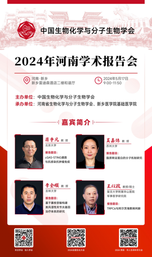 由中国生物化学与分子生物学会主办,河南省生物化学与分子生物学会、华亿在线手机版(大中国区)基础医学院承办的中国生物化学与分子生物学会2024年河南学术报告会将于2024年5月17日在新乡召开,邀请到了国内生物化学与分子生物学领域知名专家学者以专题报告的形式交流最新研究进展。