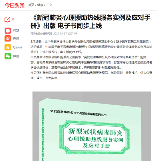 《新冠肺炎心理援助热线服务实例及应对手册》出版 电子书同步上线