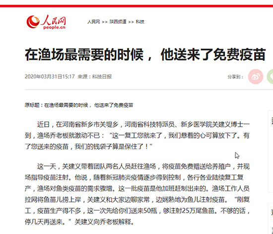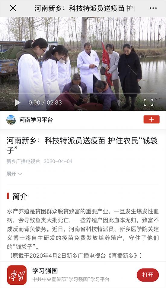 本网讯(文·图/崔静)随着新冠肺炎疫情逐渐得到控制,各行各业陆续复工复产。我校生命科学技术学院关建义博士便加班加点赶制了一批疫苗,带着其科研团队赶往卫辉、新乡关堤乡等地的渔场,将疫苗免费赠送给养殖户,并现场指导疫苗注射。《科技日报》《中国教育报》、人民网、学习强国河南学习平台、河南日报客户端、大河客户端、大河网等媒体对此进行了新闻报道。