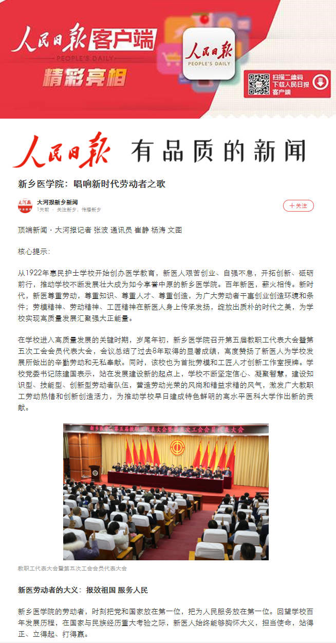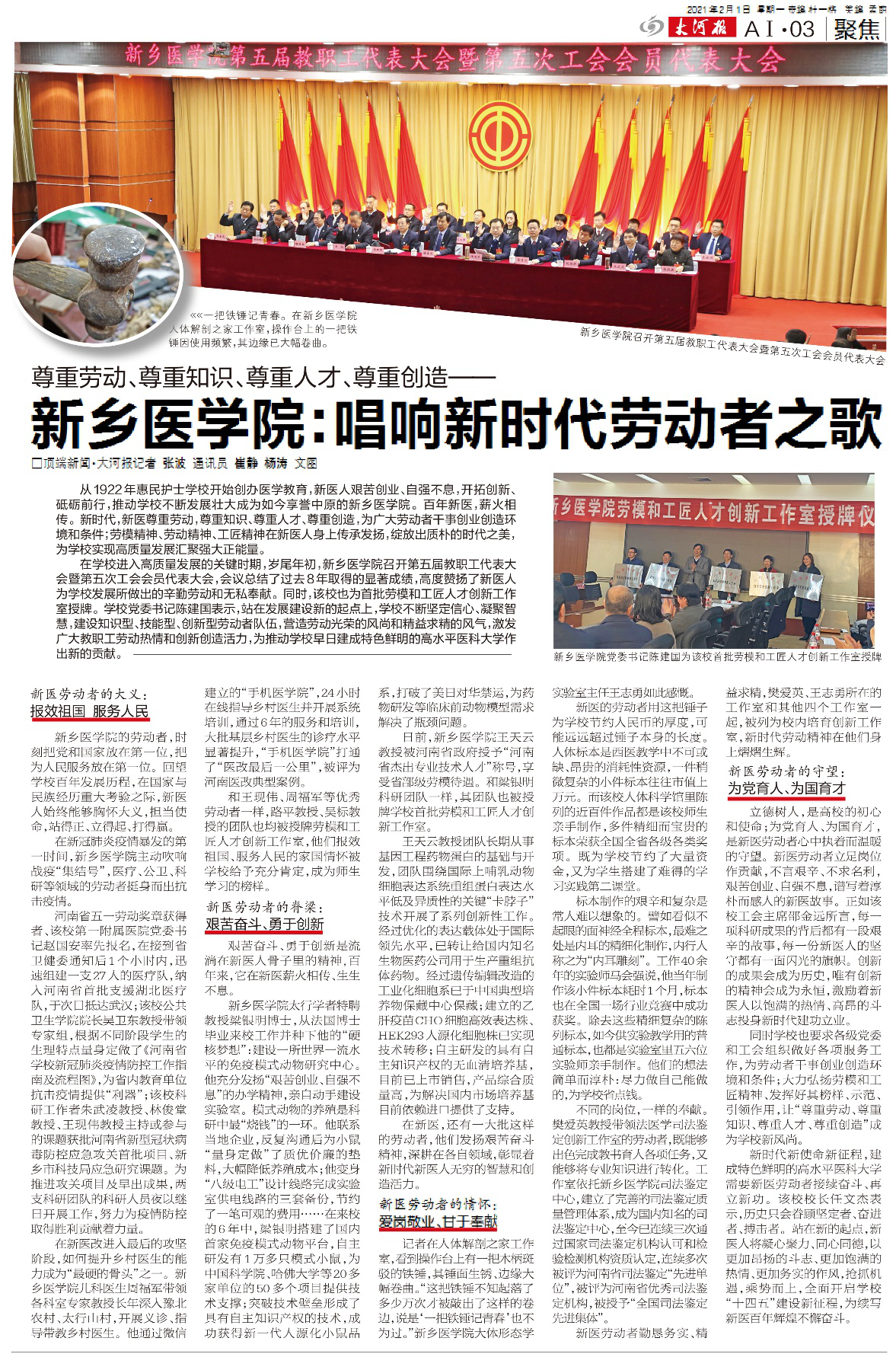 2月1日,《大河报》以《华亿在线手机版(大中国区):唱响新时代劳动者之歌》为题目,在AI·03版,对我校弘扬劳动精神给予肯定,就新医劳动者的光辉形象进行了整版宣传报道,新医劳动者生动的形象诠释了新医劳动者报效祖国、服务人民的大义,艰苦奋斗、勇于创新的脊梁,爱岗敬业、甘于奉献的情怀,为党育人、为国育才的守望。人民日报客户端、顶端新闻、今日头条对该文进行了转载报道。(供稿:刘天庆)