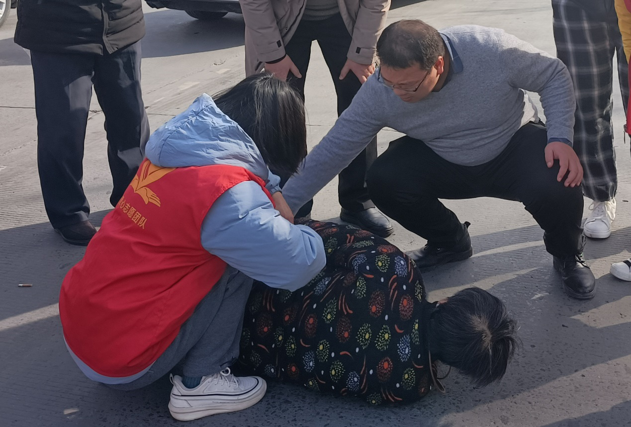 突然,一声“有人晕倒了”的喊声传来,作为一名医学专业的大学生,王冰一本能地循声望去,只见一名老人躺倒在广场对面的路上,而身旁就是来来往往的车辆,情况很危险。王冰一顾不得多想,一边大声喊着“快打120”,一边快速冲了过去。而此时,团队志愿者梁菊、赵炬兴、郭振方、侯育申等人也跟着跑了过去。