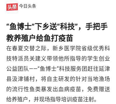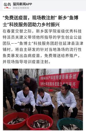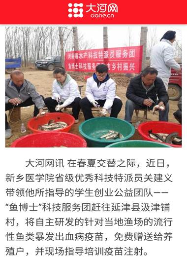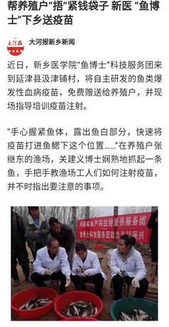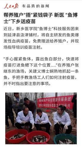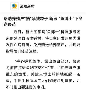 日前,我校“鱼博士”科技服务团来到延津县汲津铺村,将自主研发的鱼类爆发性血病疫苗,免费赠送给养殖户,并现场指导培训疫苗注射。人民日报客户端、大河网、顶端新闻、猛犸新闻、大河报新乡新闻、河南商报新乡新闻、今日头条等媒体对此进行报道。 (供稿:刘天庆 李春晓)