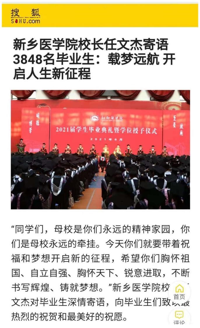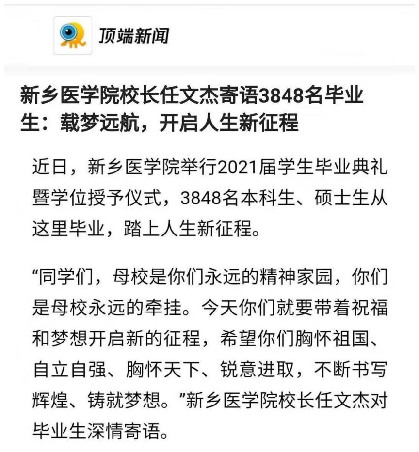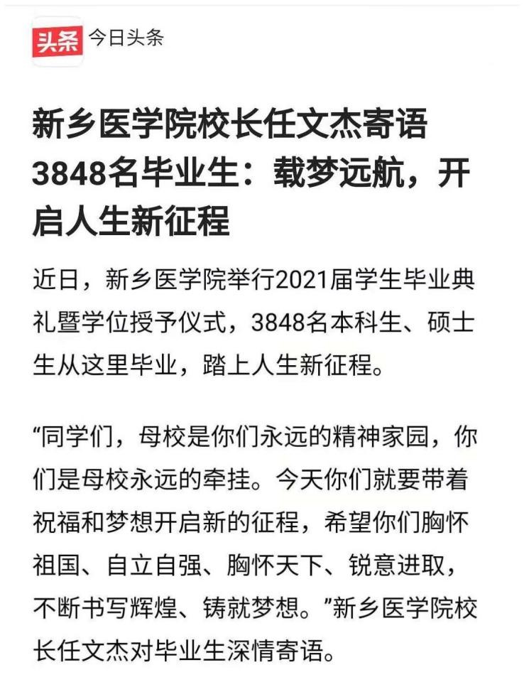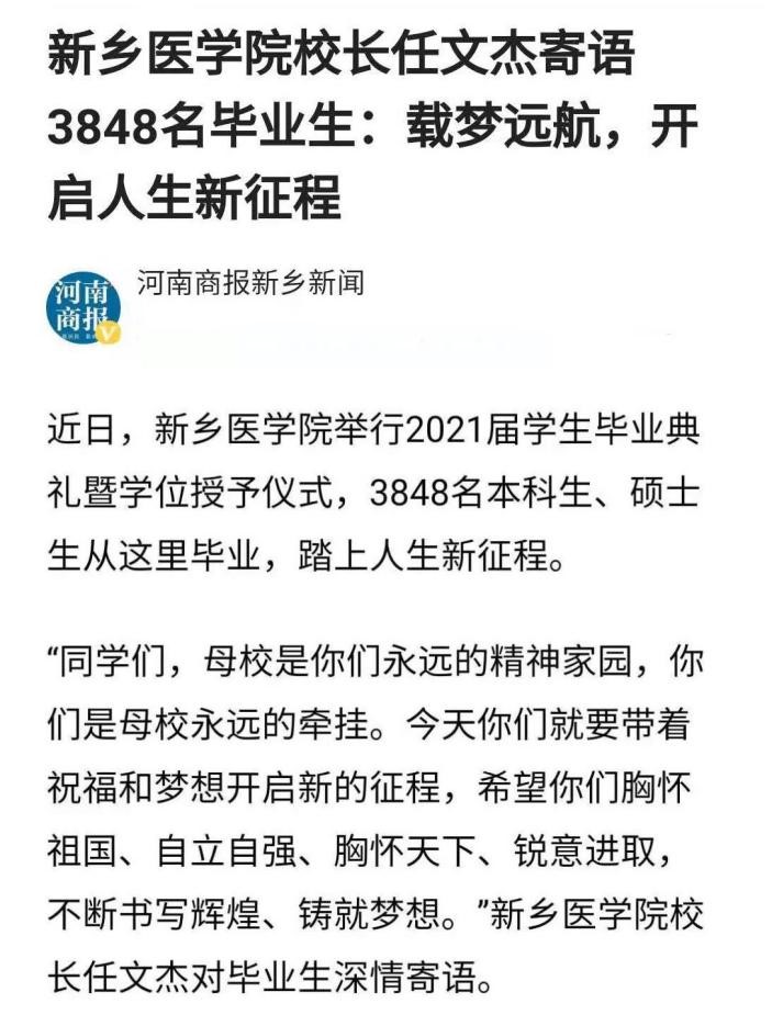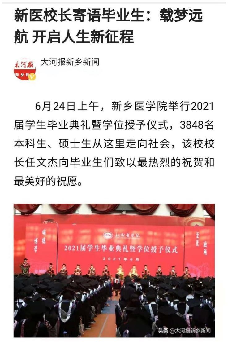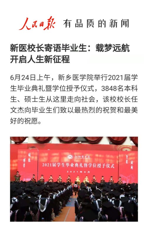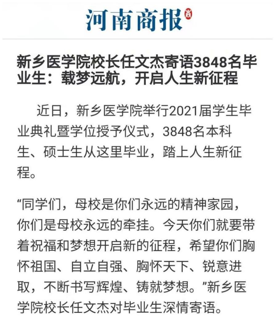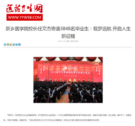 日前,我校举行2021届学生毕业典礼暨学位授予仪式,3848名本科生、硕士生从这里毕业,踏上人生新征程。校长任文杰对毕业生深情寄语:要胸怀祖国,成为人民健康的保卫者;要自立自强,成为逆境中保持激情的奋斗者;要胸怀天下,成为走在时代前列的开拓者;要锐意进取,成为创新前沿的引领者。(供稿:刘天庆)