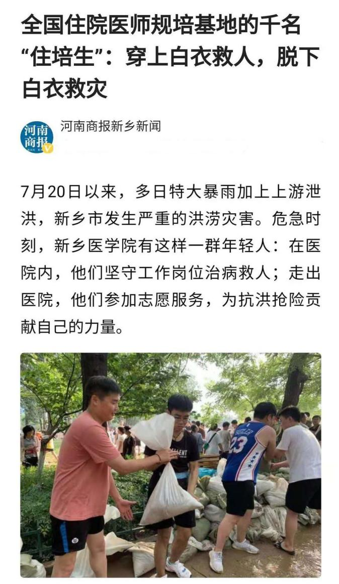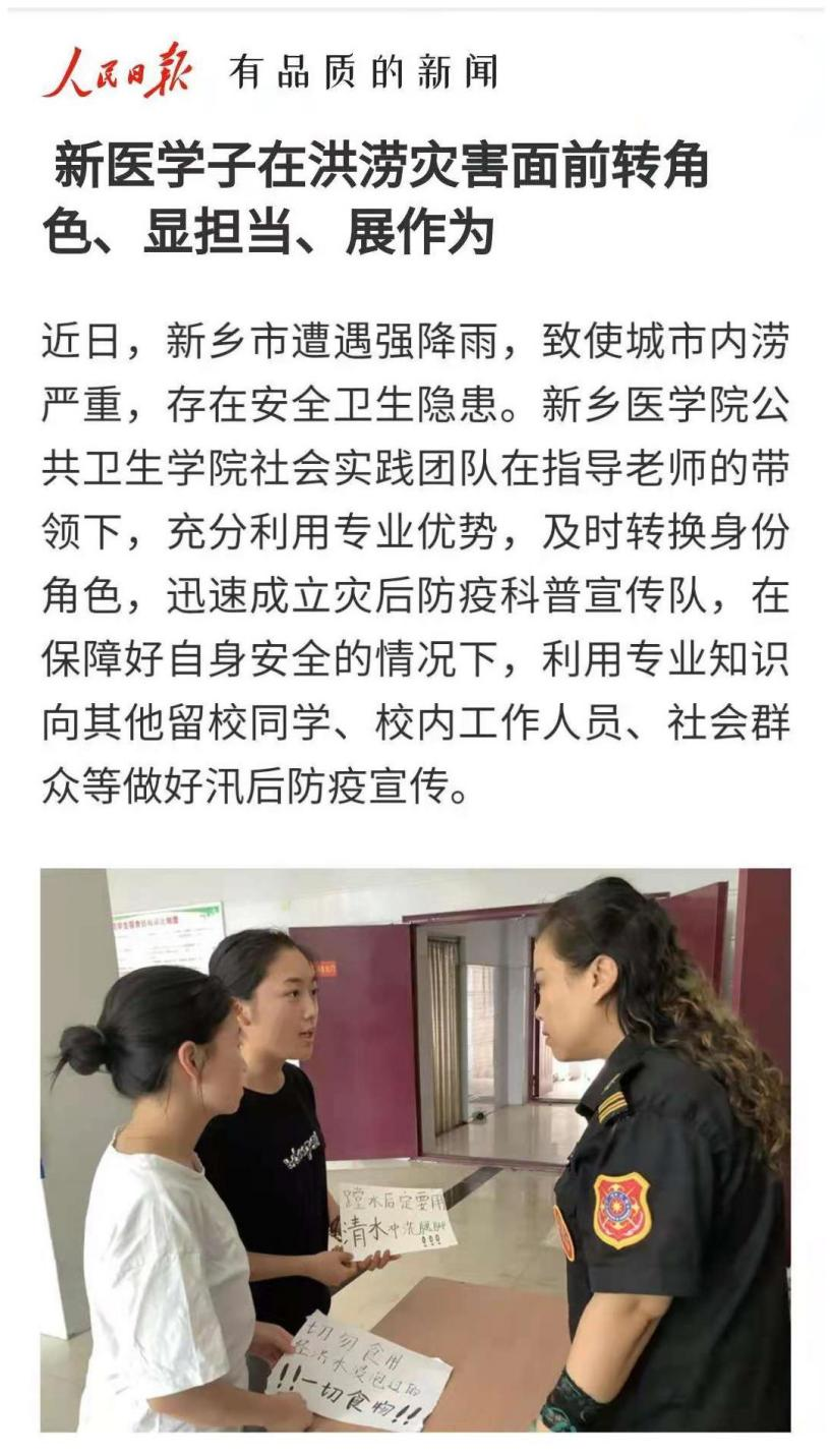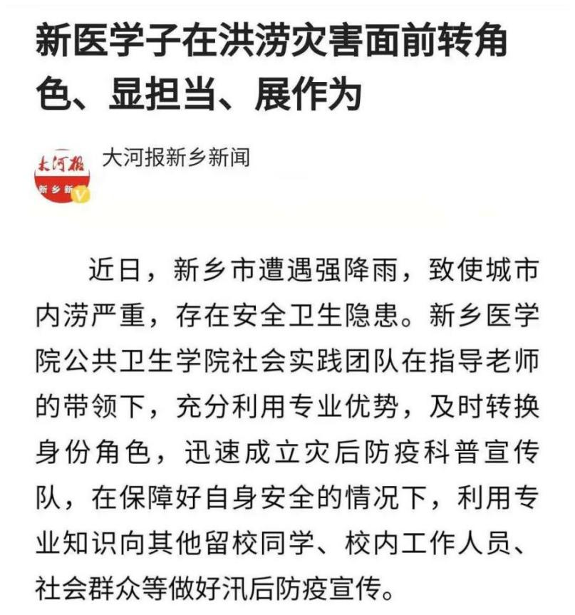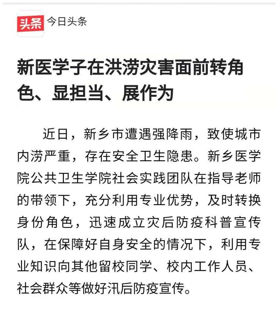 日前,我市因多日暴雨遭受重大洪涝灾害。危急时刻,我校学子挺身而出参加志愿服务,抢险救灾、宣传抗疫知识……用实际行动彰显新医青年的责任担当。