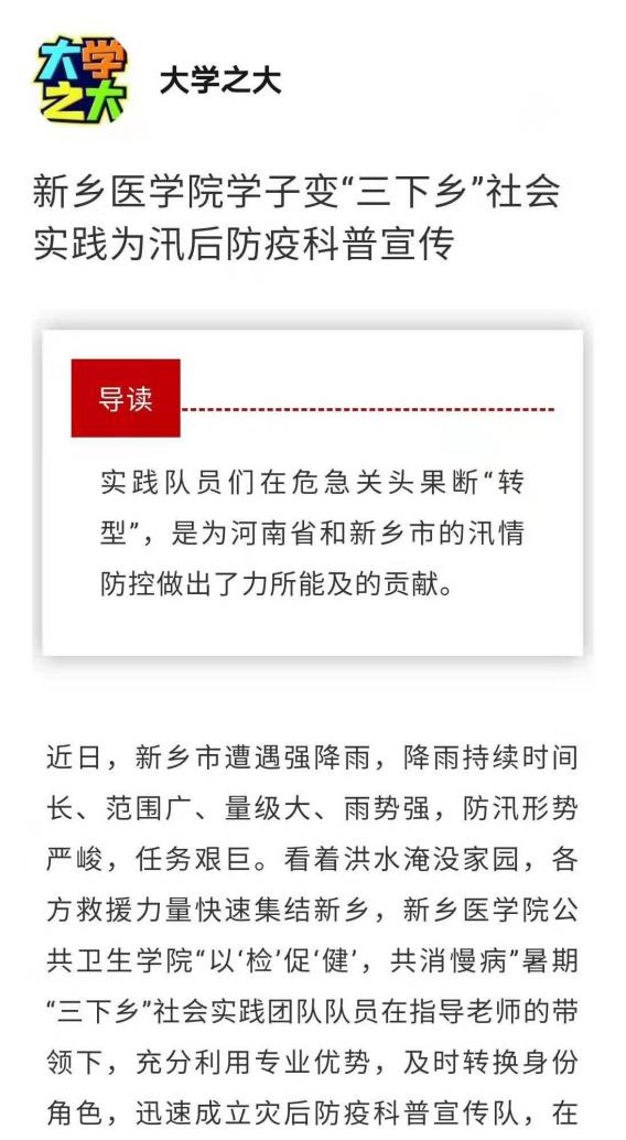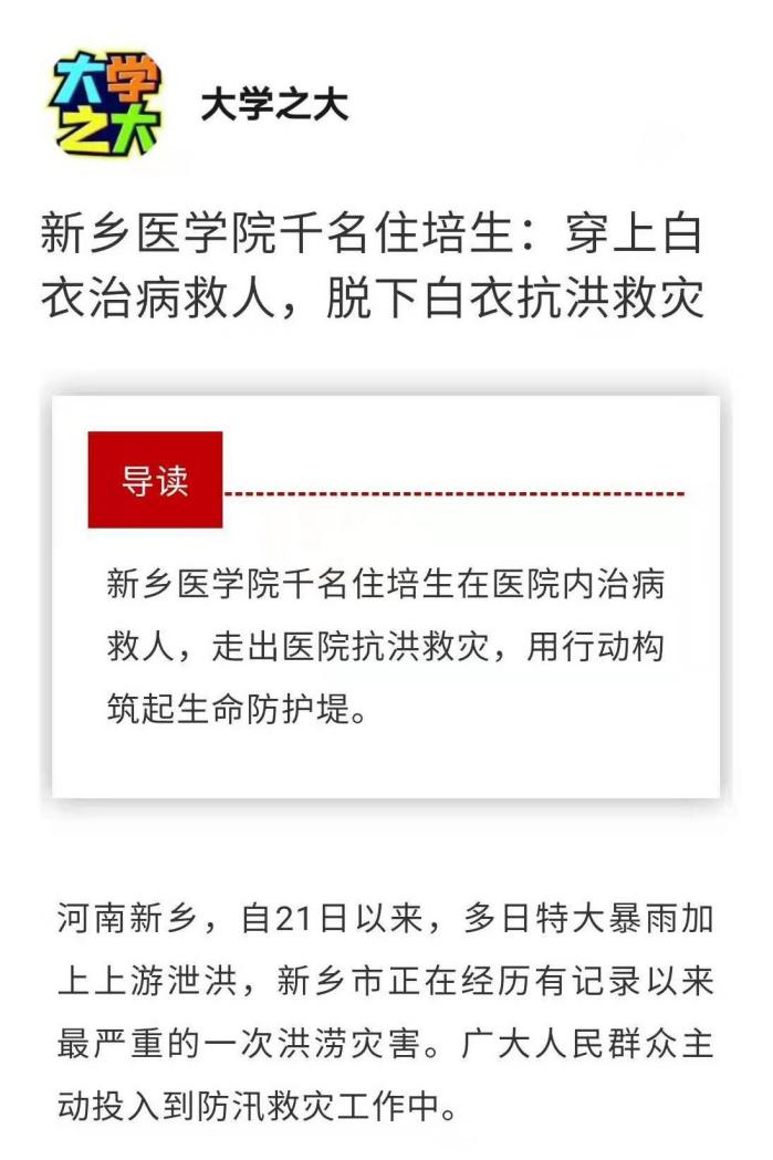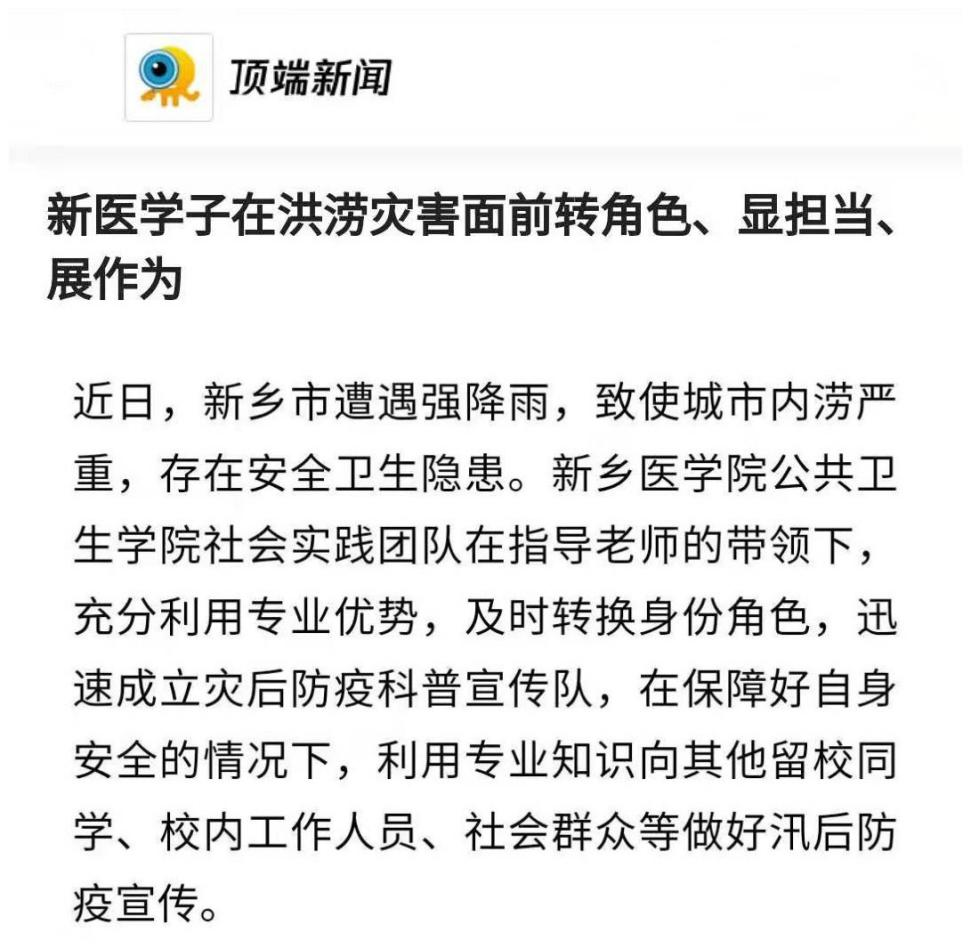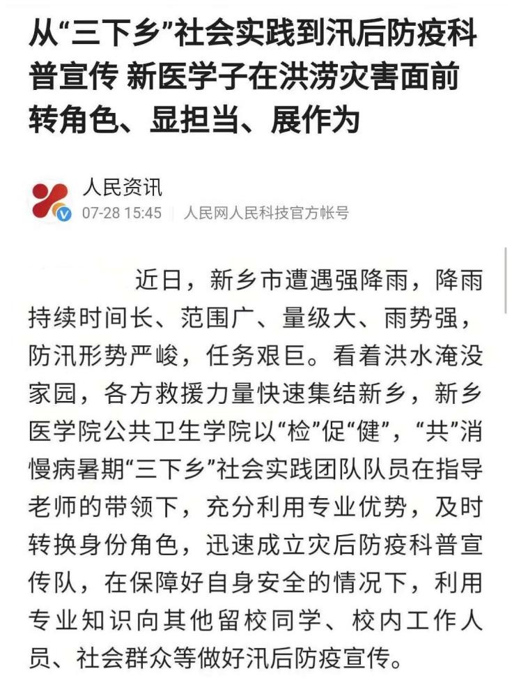 日前,我市因多日暴雨遭受重大洪涝灾害。危急时刻,我校学子挺身而出参加志愿服务,抢险救灾、宣传抗疫知识……用实际行动彰显新医青年的责任担当。