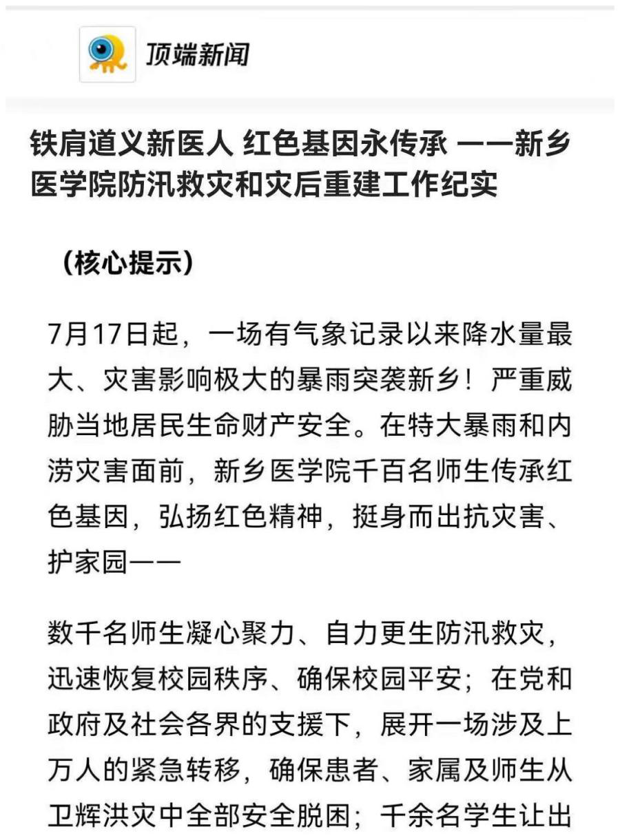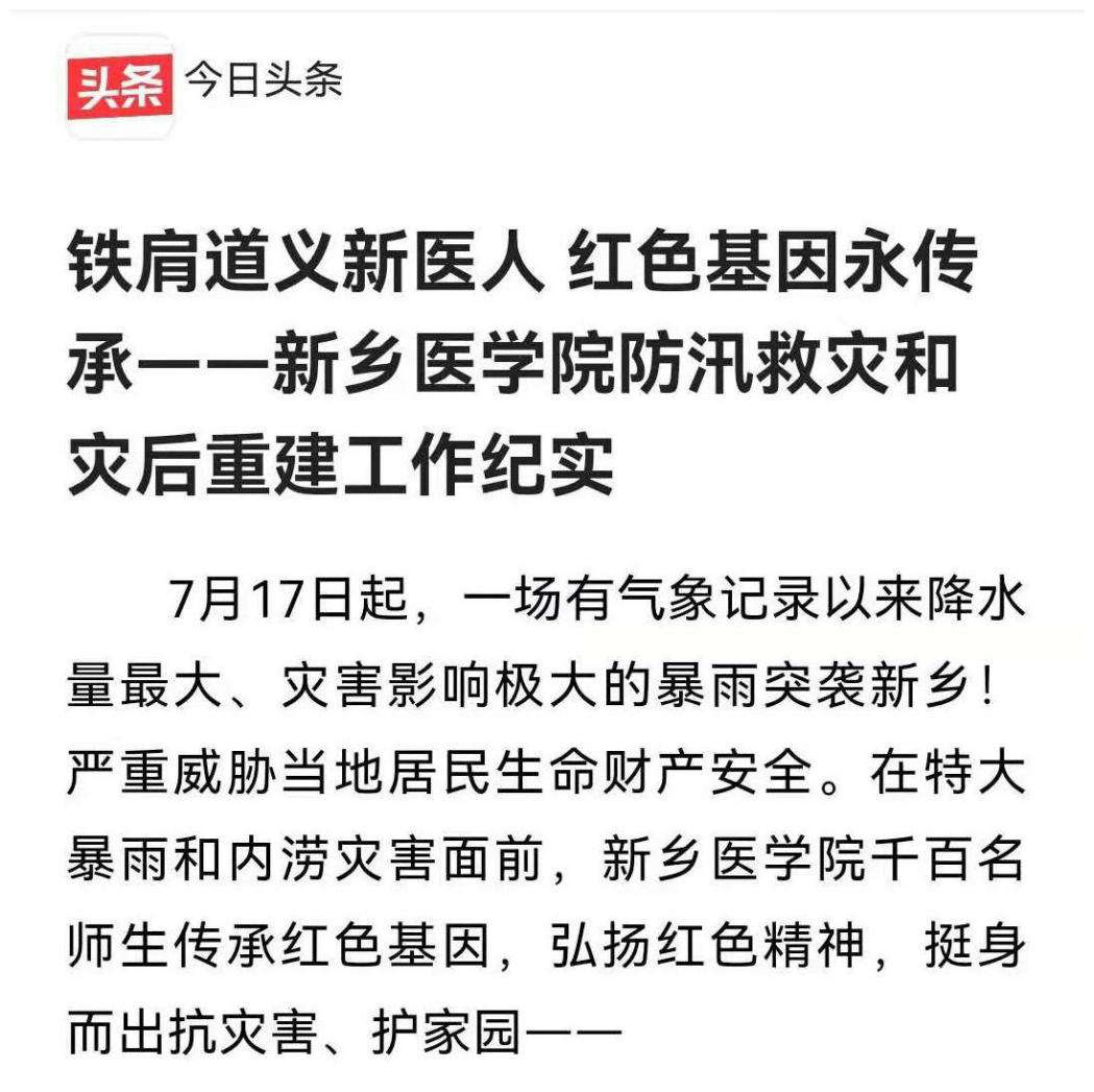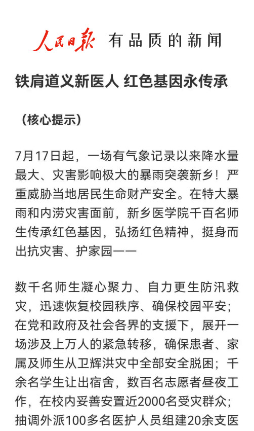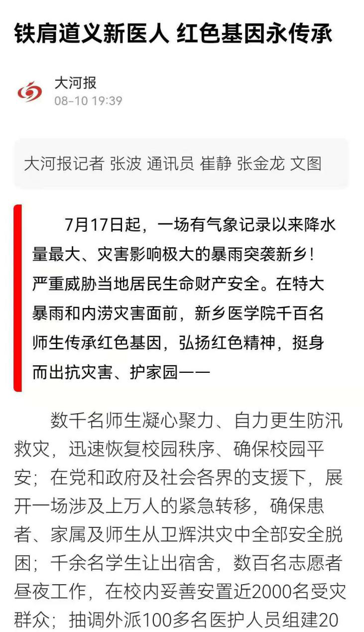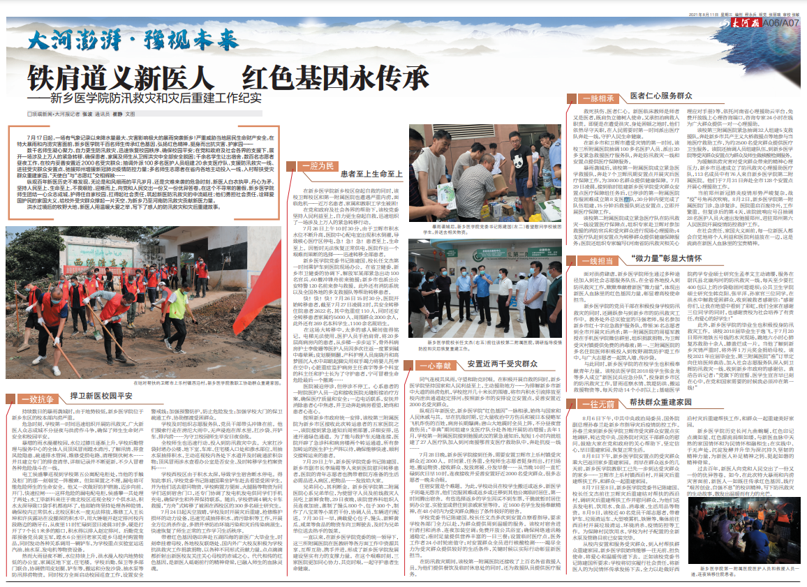 8月10日,以《铁肩道义新医人 红色基因永传承》为题,《大河报》在A06和A07通版中,以一致抗争,捍卫新医校园平安;一腔为民,患者至上生命至上;一心奉献,安置近两千受灾群众;一脉相承,医者仁心服务群众;一线担当,“微力量”彰显大情怀;一往无前,帮扶群众重建家园等六个方面,深入报道我校在特大暴雨和内涝灾害面前,挺身而出抗灾害、护家园。人民日报客户端、顶端新闻、大河报客户端、今日头条等多家媒体转载。
