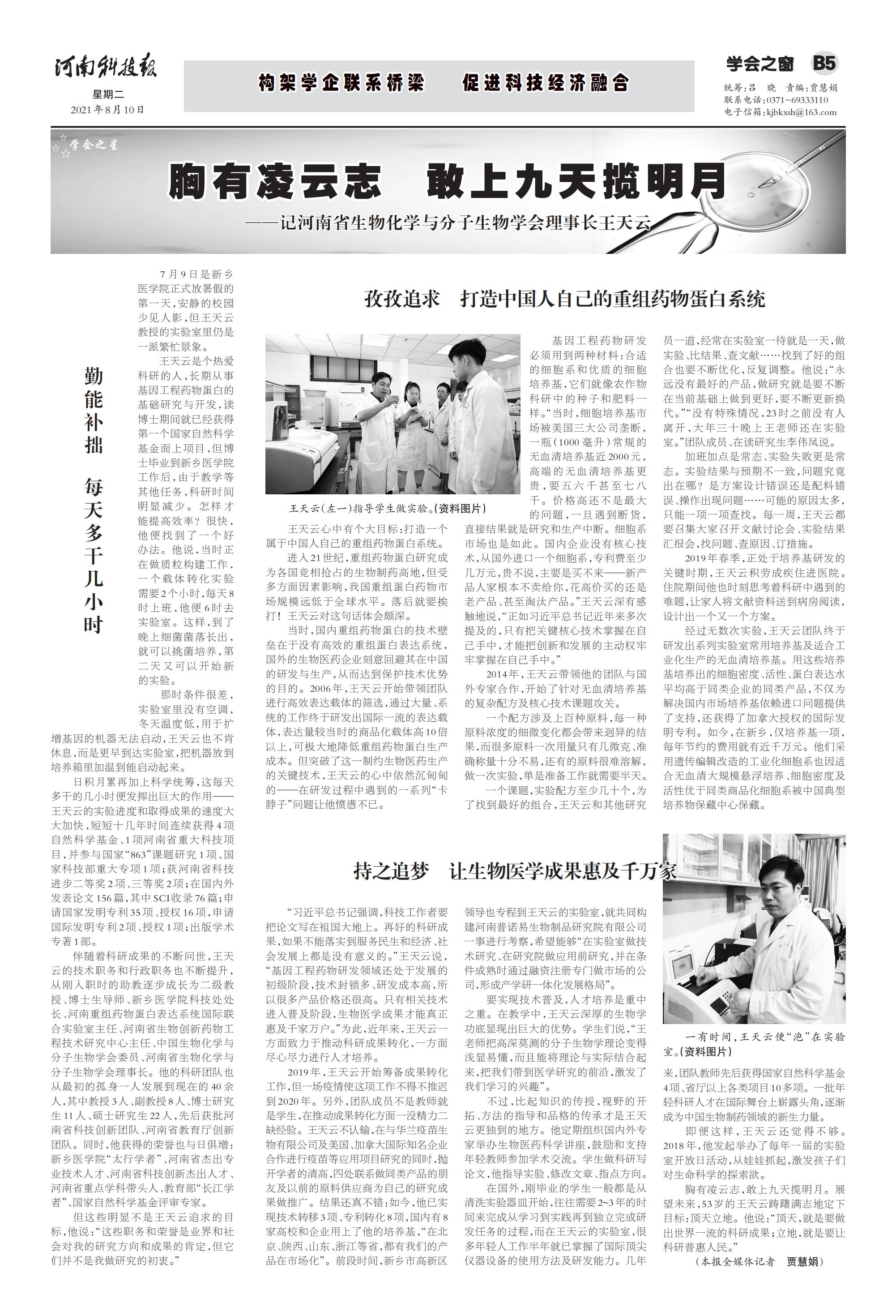 8月10日,《河南科技报》B5版,以《胸有凌云志敢上九天揽明月——记河南省生物化学与分子生物学会理事长王天云》为题进行整版报道。