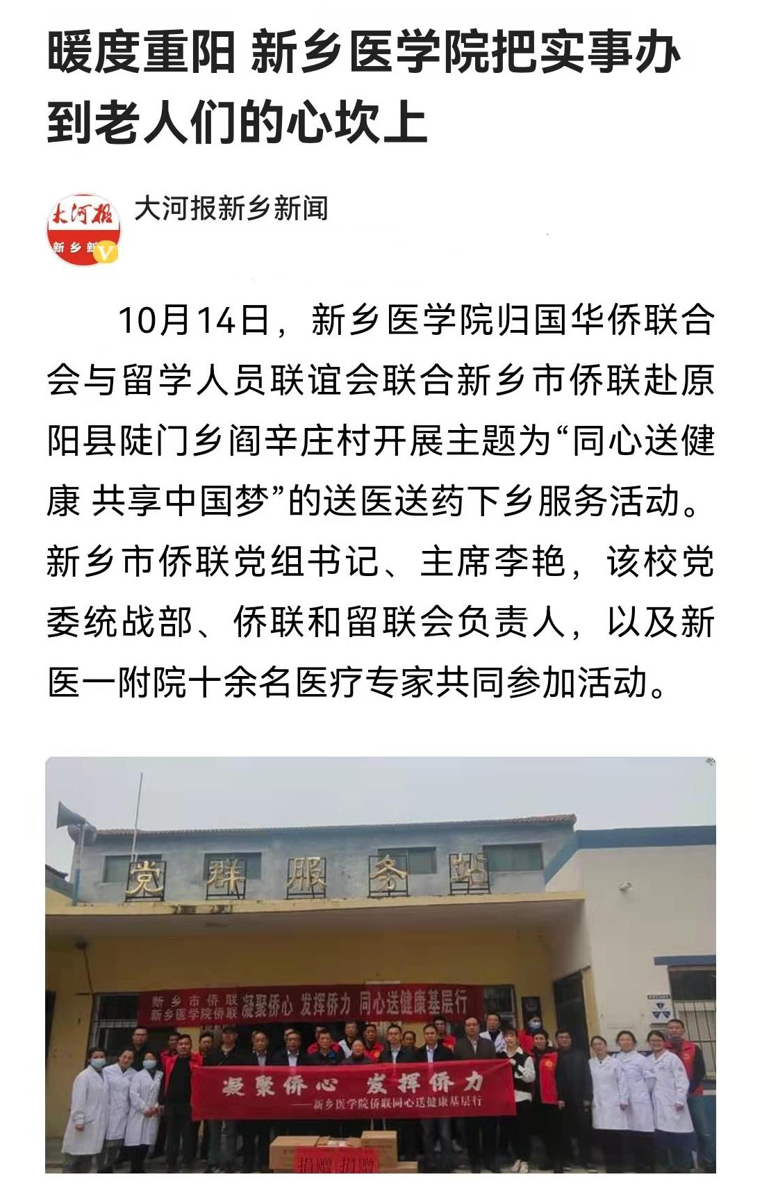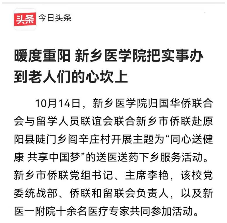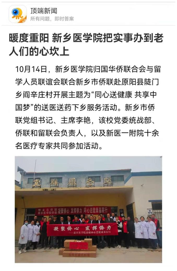 10月14日,我校归国华侨联合会与留学人员联谊会联合新乡市侨联赴原阳县陡门乡阎辛庄村开展主题为“同心送健康 共享中国梦”的送医送药下乡服务活动。活动现场,医疗专家为近千名村民开展义诊服务,为村内老人精心准备了折叠帐篷、常备药品等物资;活动结束后,结合党史学习教育主题,共同参观了原阳县抗日民主政府纪念地。顶端新闻、大河报新乡新闻、今日头条等媒体对此进行报道。(供稿:刘天庆)