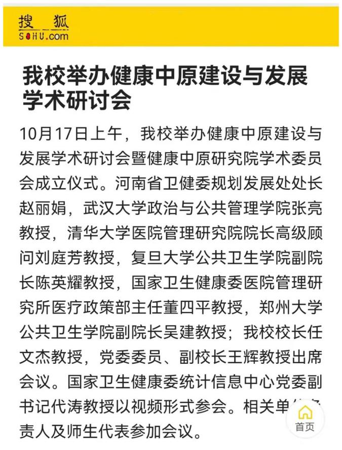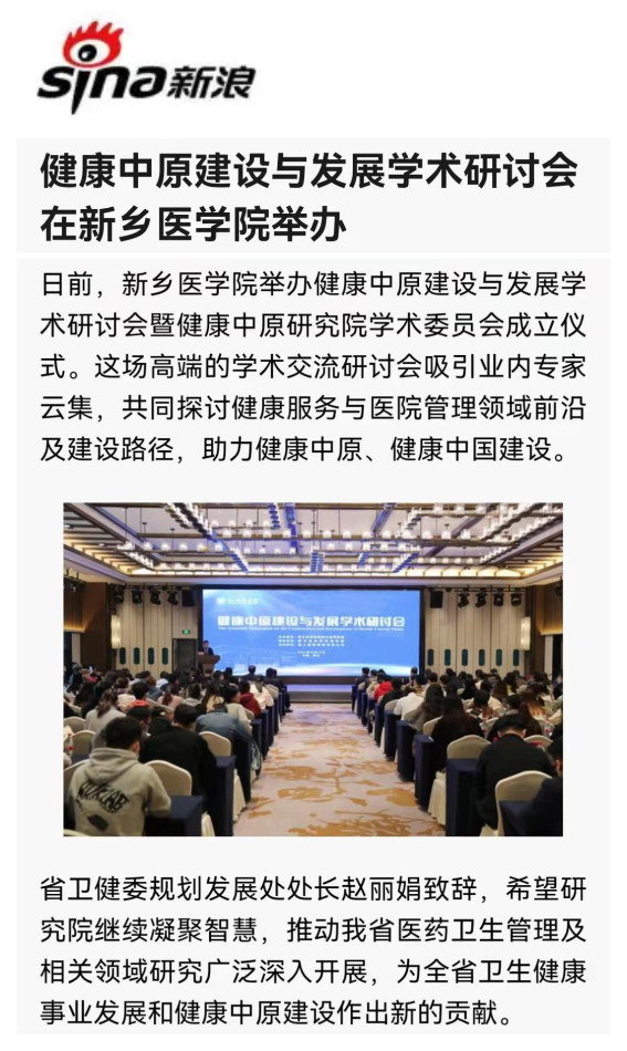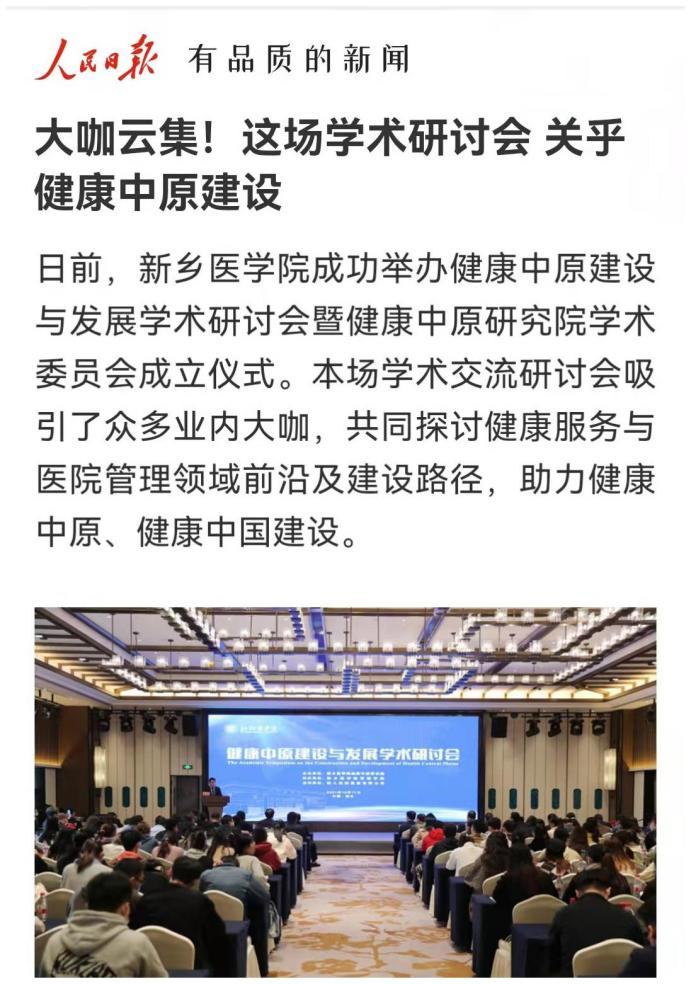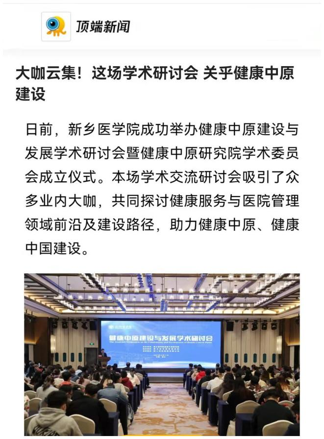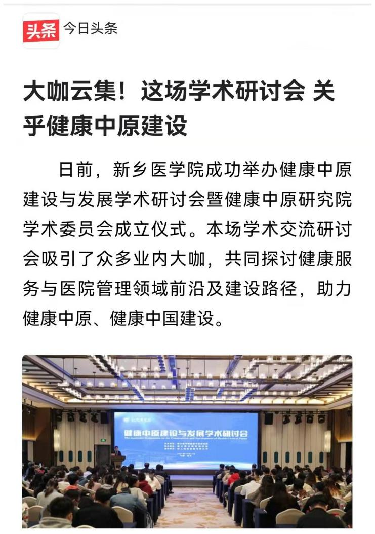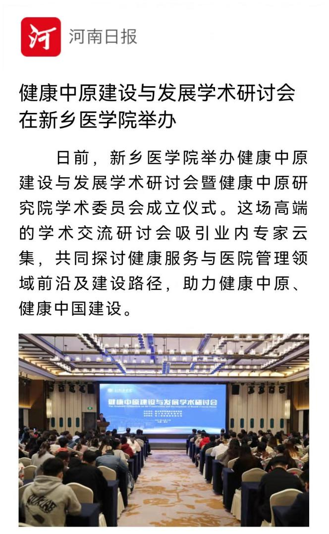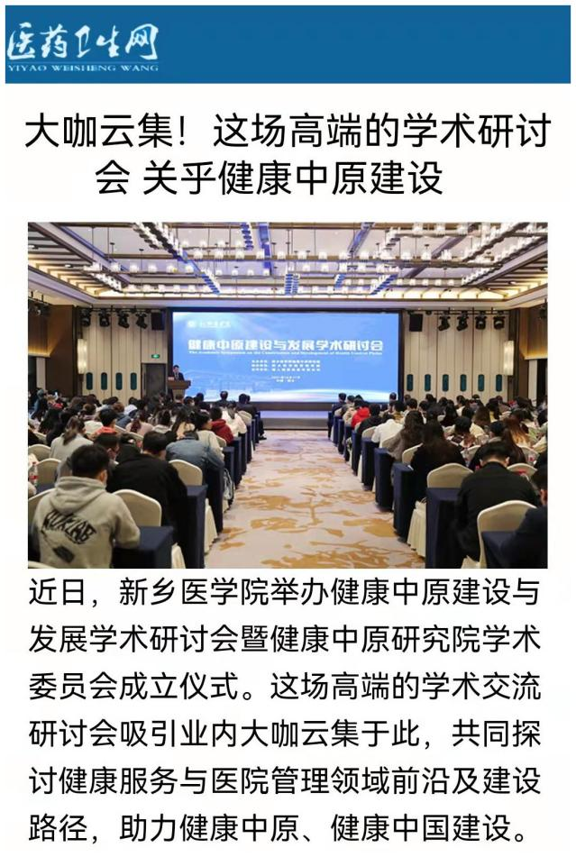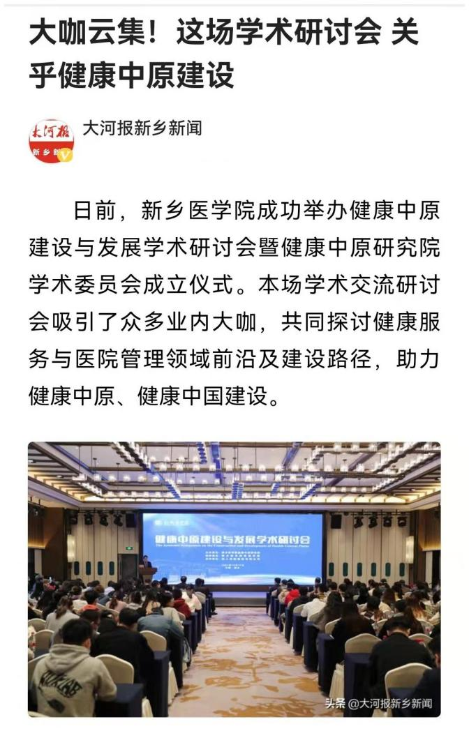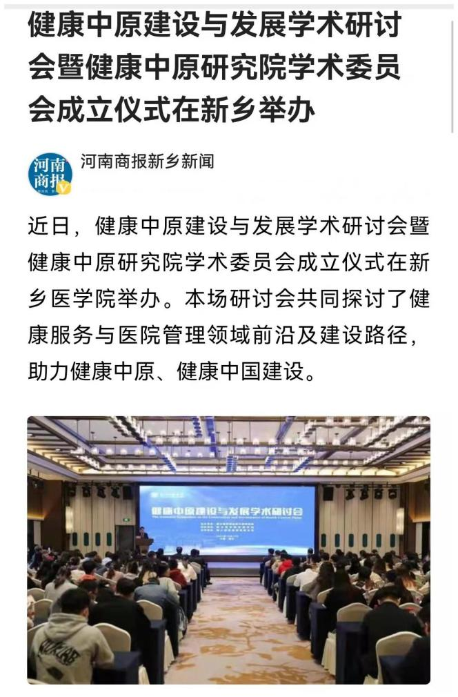 日前,我校成功举办健康中原建设与发展学术研讨会暨健康中原研究院学术委员会成立仪式。本场学术交流研讨会吸引了众多业内大咖,共同探讨健康服务与医院管理领域前沿及建设路径,助力健康中原、健康中国建设。多家媒体对此报道。(供稿人:刘天庆)