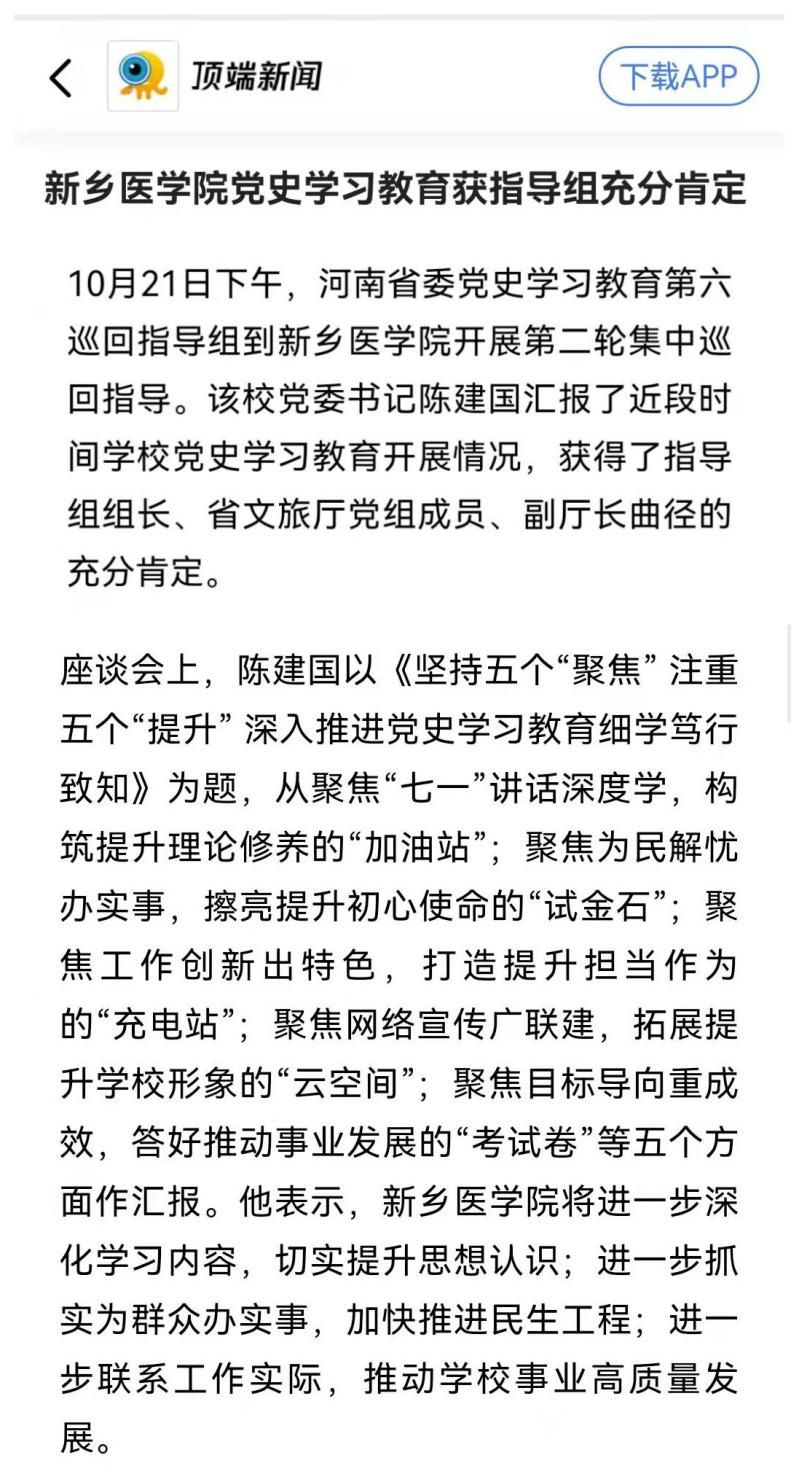 《新乡日报》报道省委党史学习教育第六巡回指导组到我校开展巡回指导工作