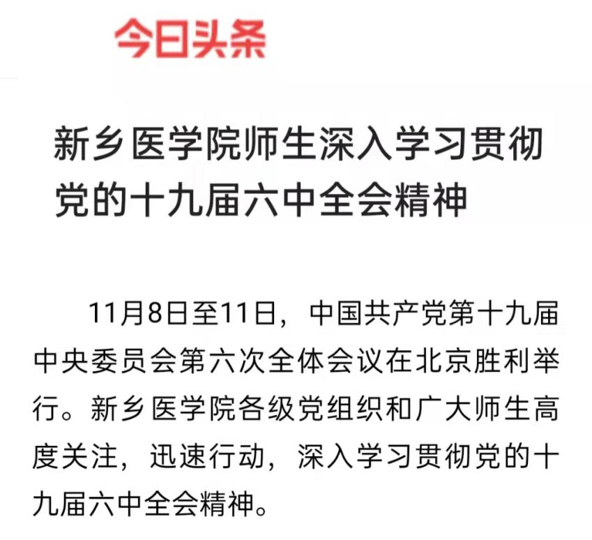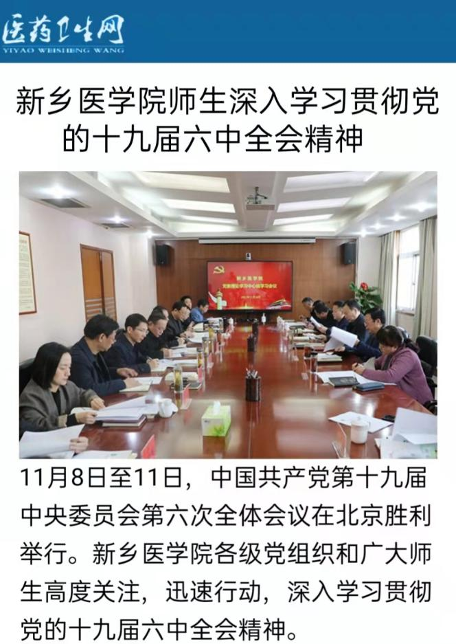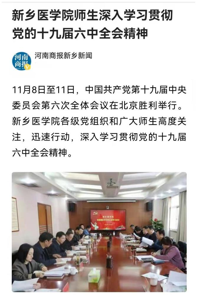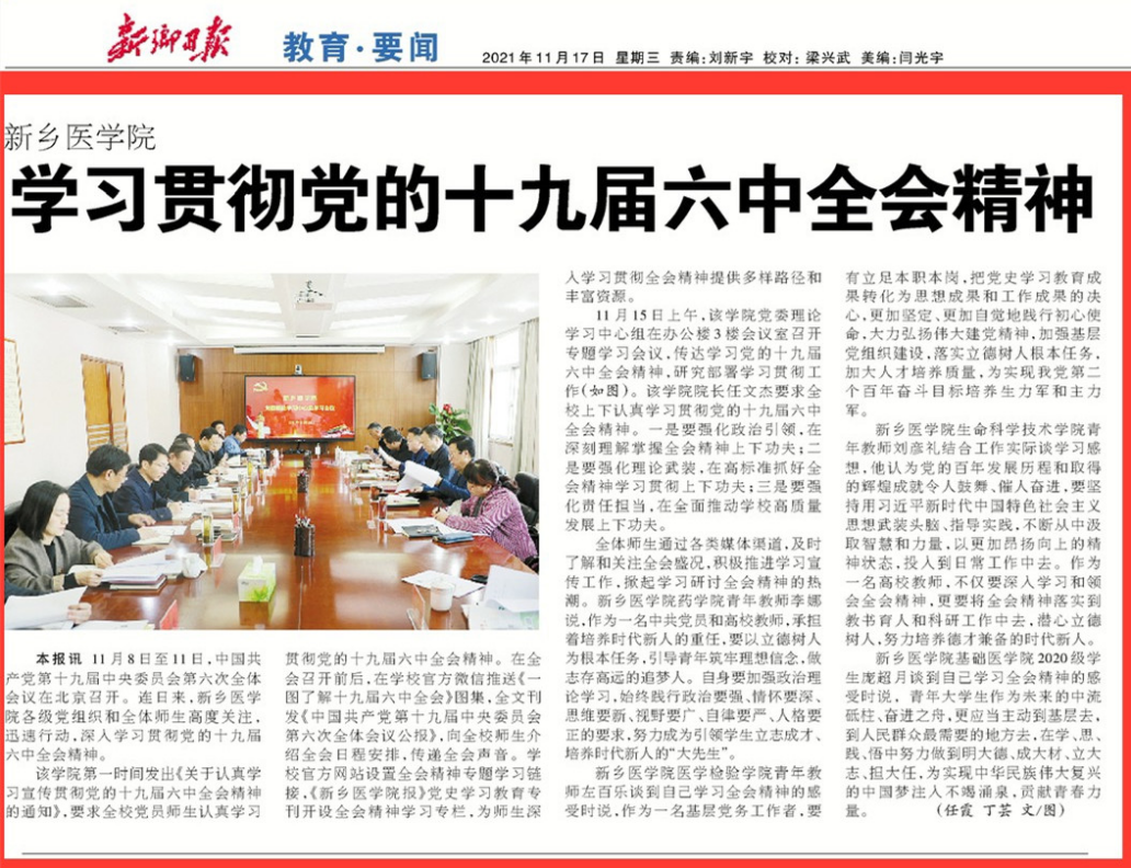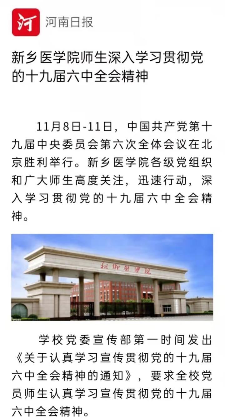 11月8日至11日,中国共产党第十九届中央委员会第六次全体会议在北京胜利举行。我校广大师生通过各类媒体渠道及时了解和关注全会盛况,积极推进学习宣传工作,掀起学习研讨全会精神的热潮。新华网客户端、河南日报客户端、顶端新闻、医药卫生网、大河报新乡新闻、河南商报新乡新闻、网易新闻、今日头条等多家媒体进行报道。《新乡日报》于11月17日第05版头条刊发。(供稿:刘天庆 周子媛)