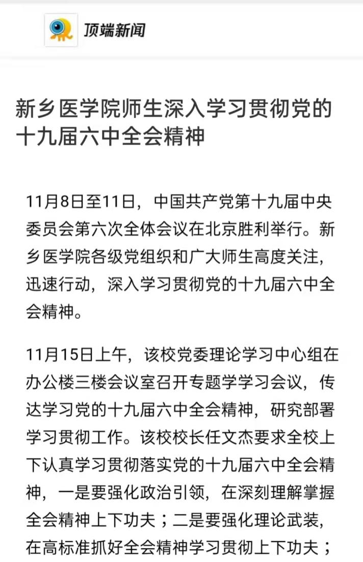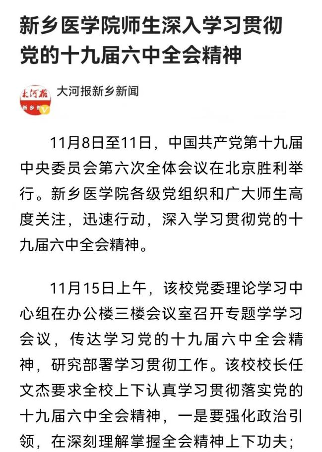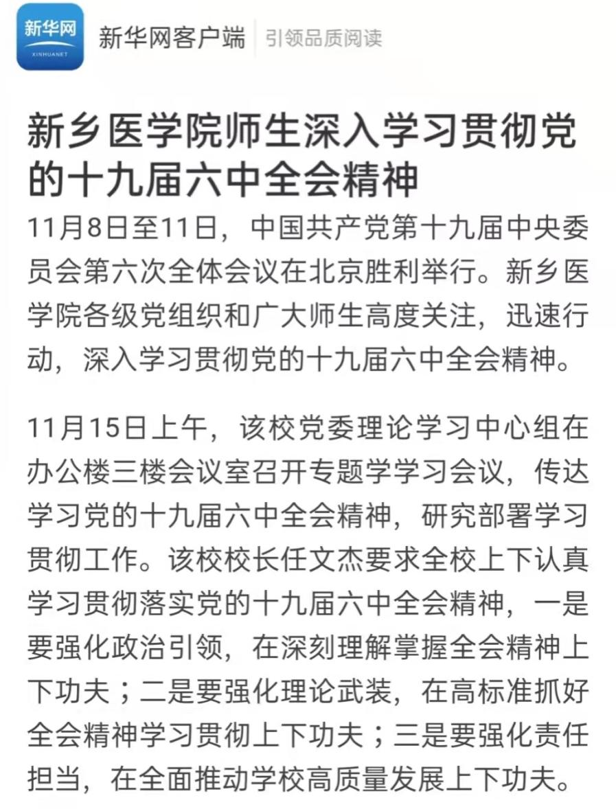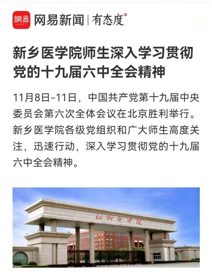 11月8日至11日,中国共产党第十九届中央委员会第六次全体会议在北京胜利举行。我校广大师生通过各类媒体渠道及时了解和关注全会盛况,积极推进学习宣传工作,掀起学习研讨全会精神的热潮。新华网客户端、河南日报客户端、顶端新闻、医药卫生网、大河报新乡新闻、河南商报新乡新闻、网易新闻、今日头条等多家媒体进行报道。《新乡日报》于11月17日第05版头条刊发。(供稿:刘天庆 周子媛)