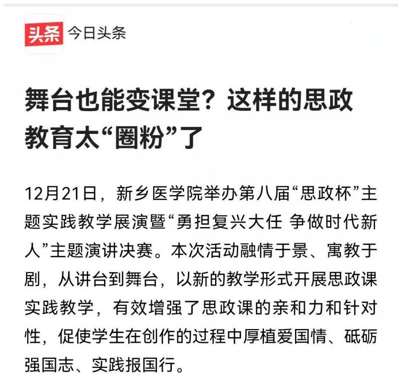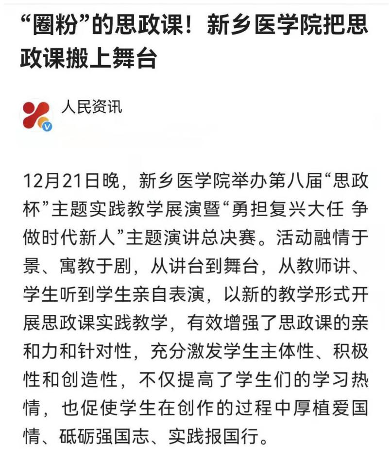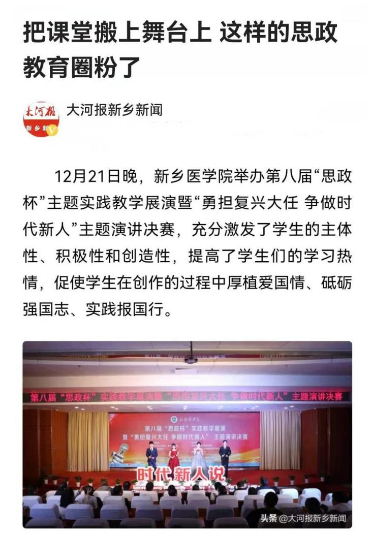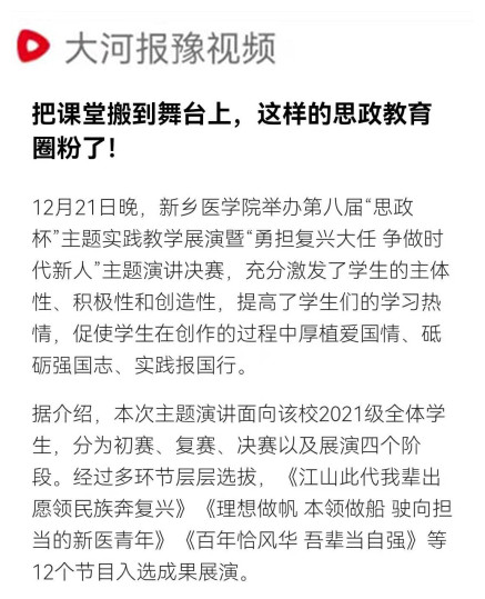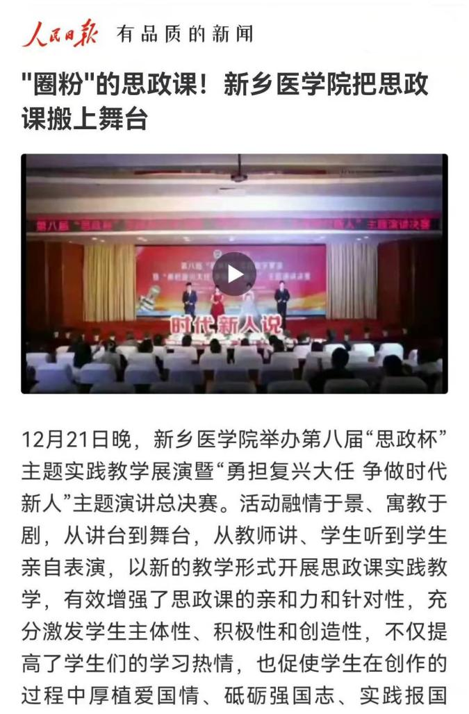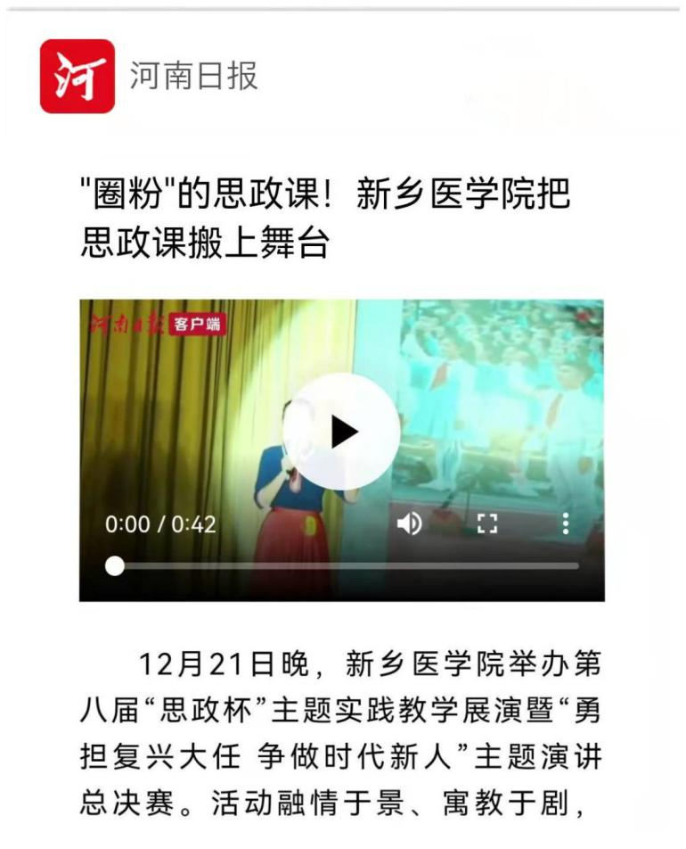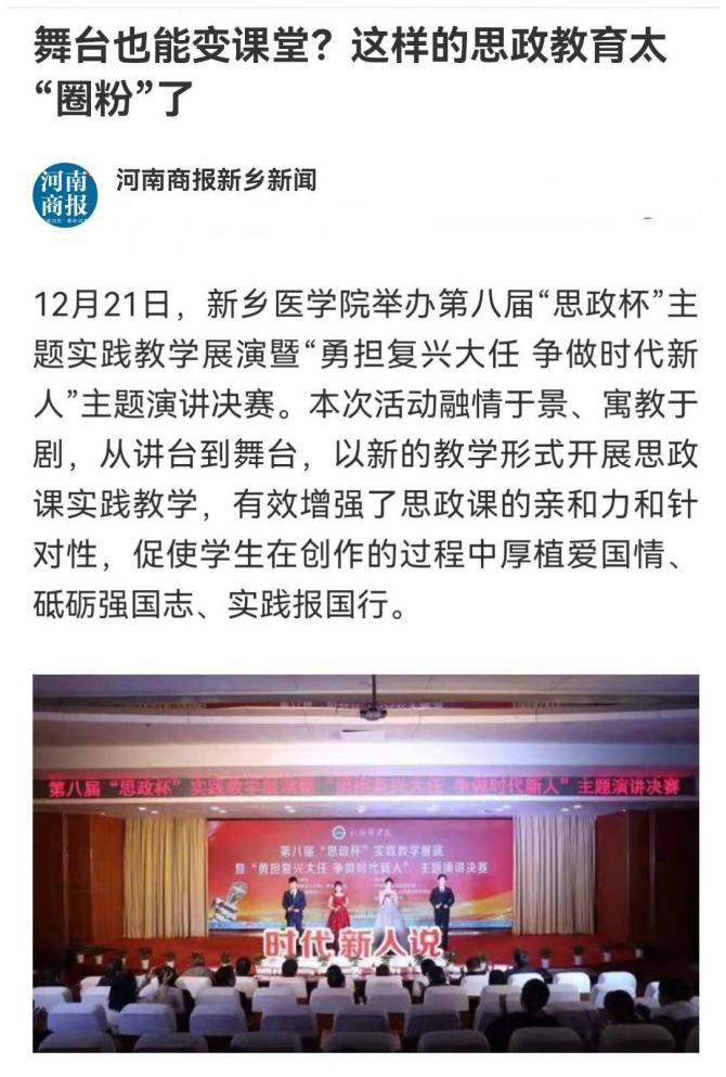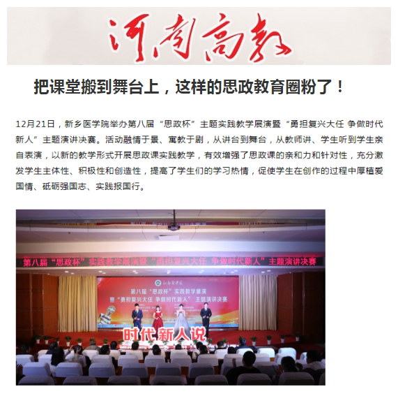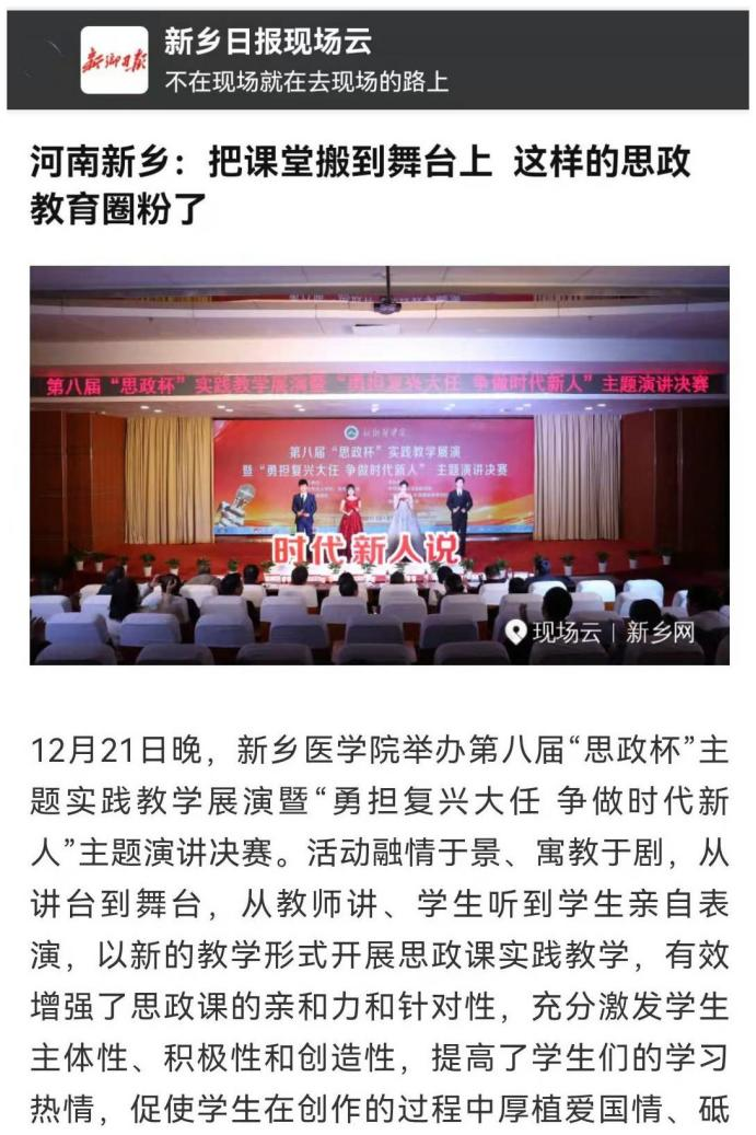 12月21日,我校举办第八届“思政杯”主题实践教学展演暨“勇担复兴大任 争做时代新人”主题演讲决赛。整场展演活动催人奋进,充分展示了新时代医学生奋发向上的精神面貌。多家媒体进行报道。(供稿:刘天庆)