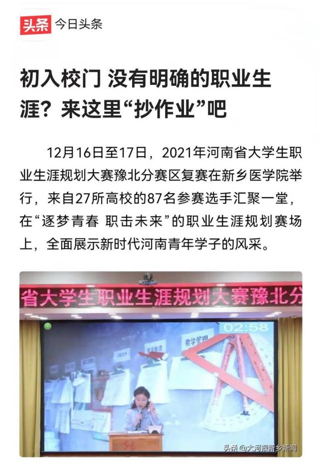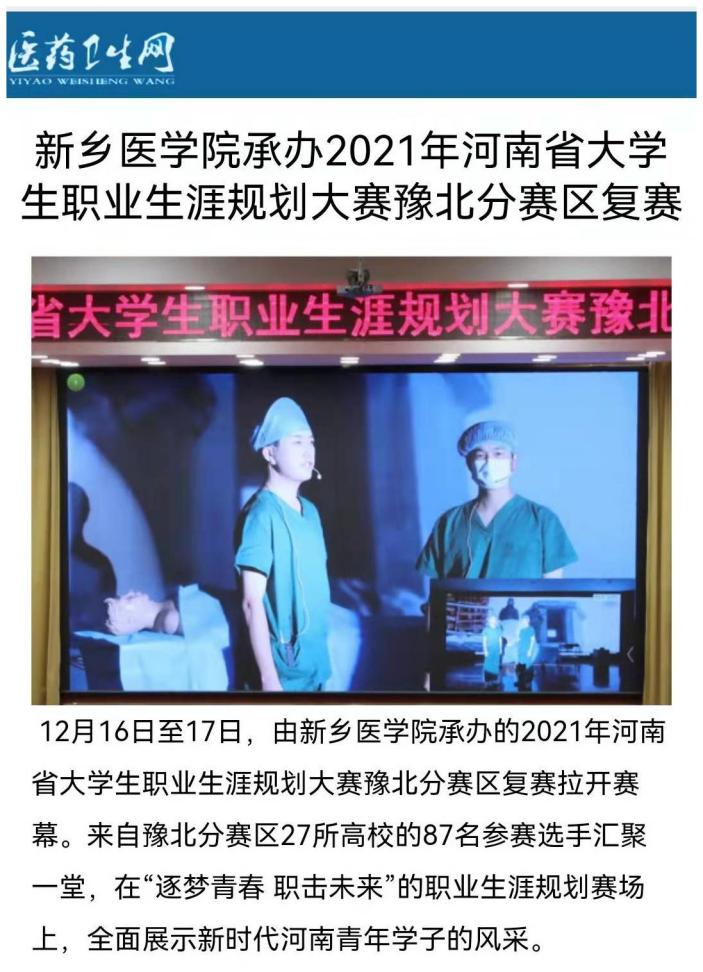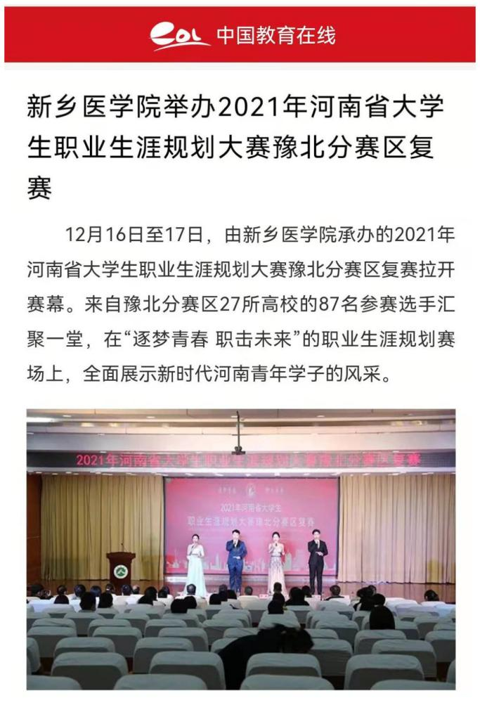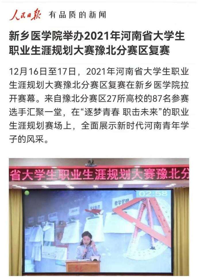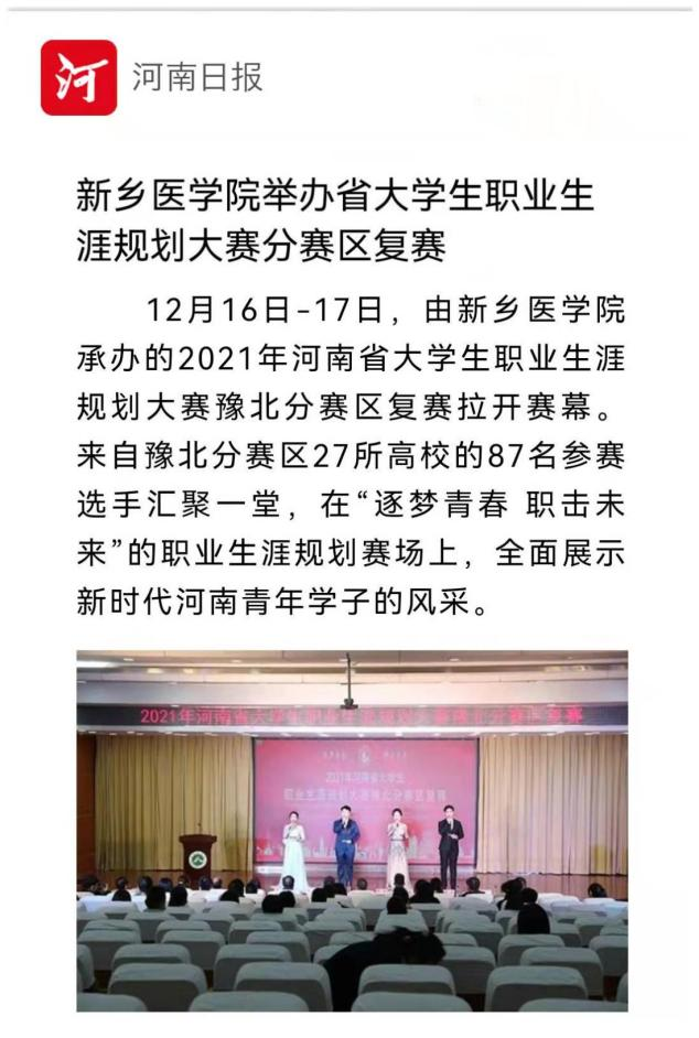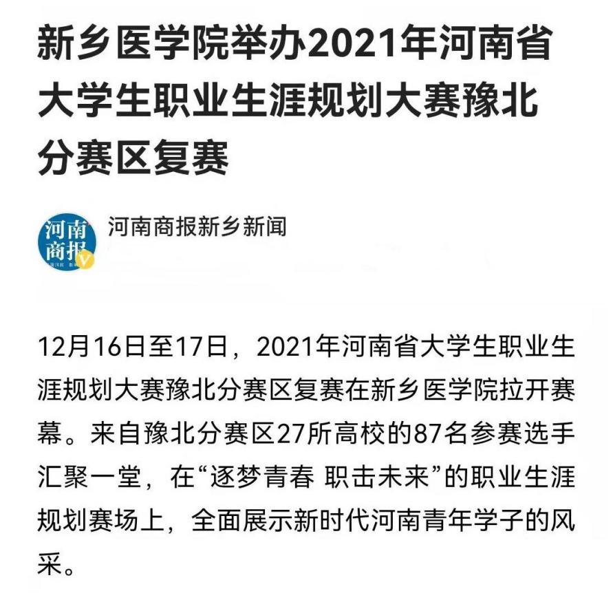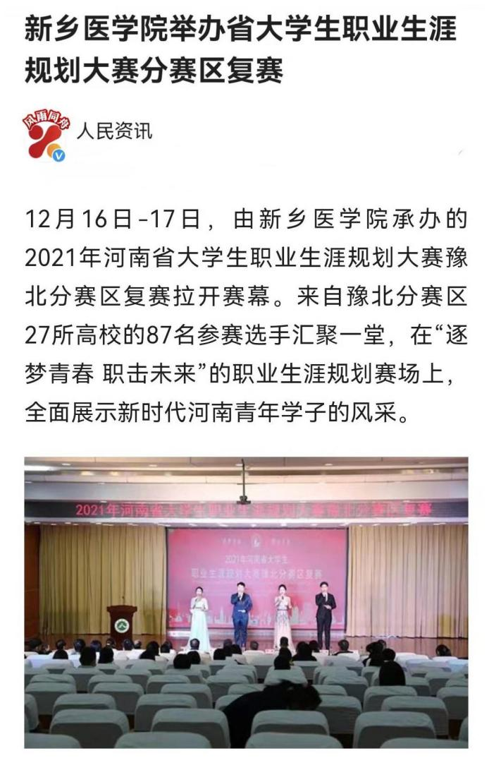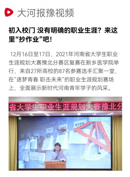 12月16日-17日,由我校承办的2021年河南省大学生职业生涯规划大赛豫北分赛区复赛开赛。来自豫北分赛区27所高校的87名参赛选手汇聚一堂展示风采。多家媒体进行报道。(供稿:刘天庆)