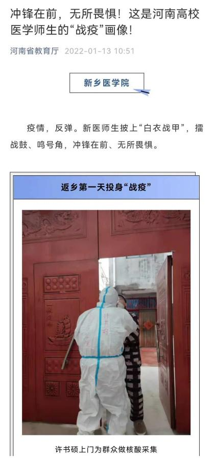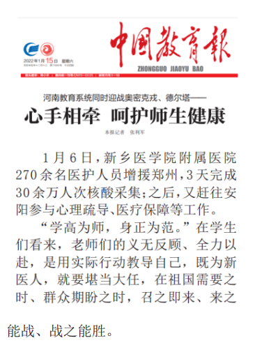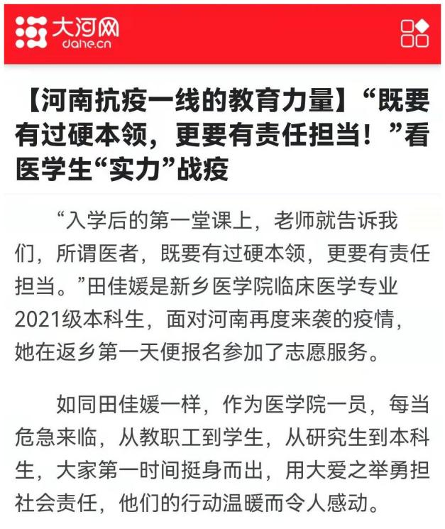 疫情反弹之时,我校三所附属医院医务人员分别支援郑州、安阳疫情防控工作;我校实习生、本科生、研究生等以老师为榜样,也分别为郑州、家乡等地疫情防控工作作出自己的贡献。多家媒体报道。(供稿:刘天庆)